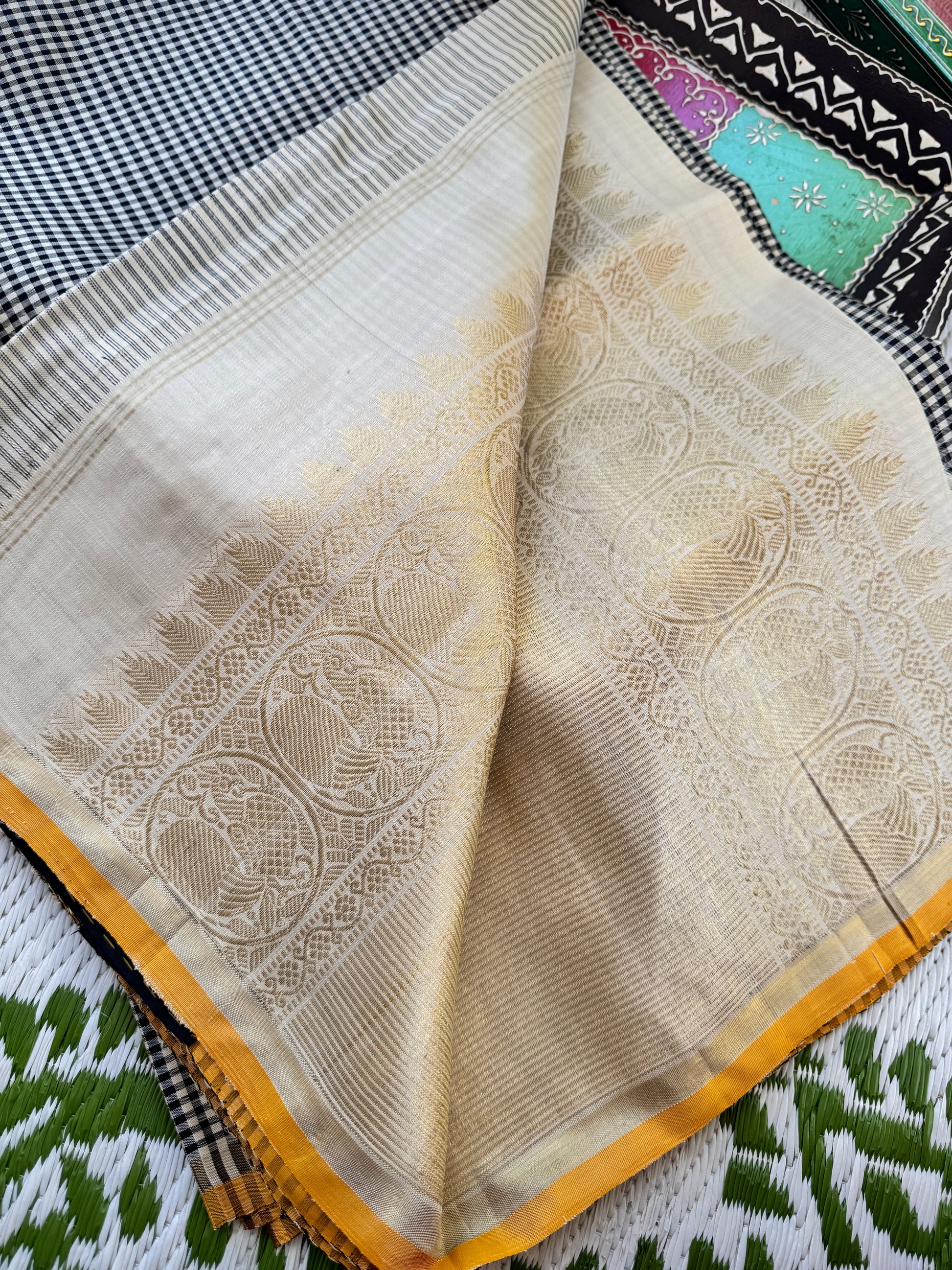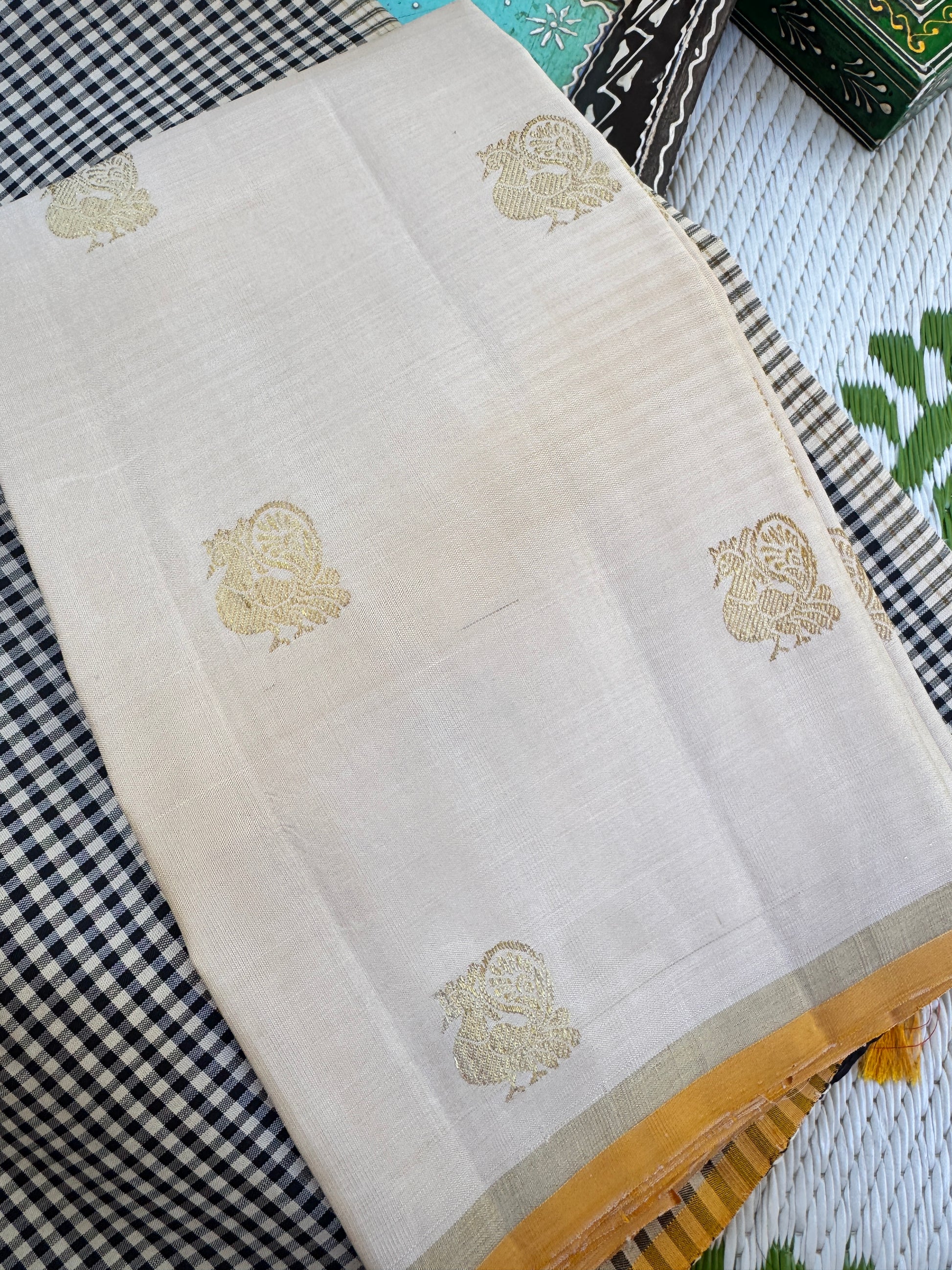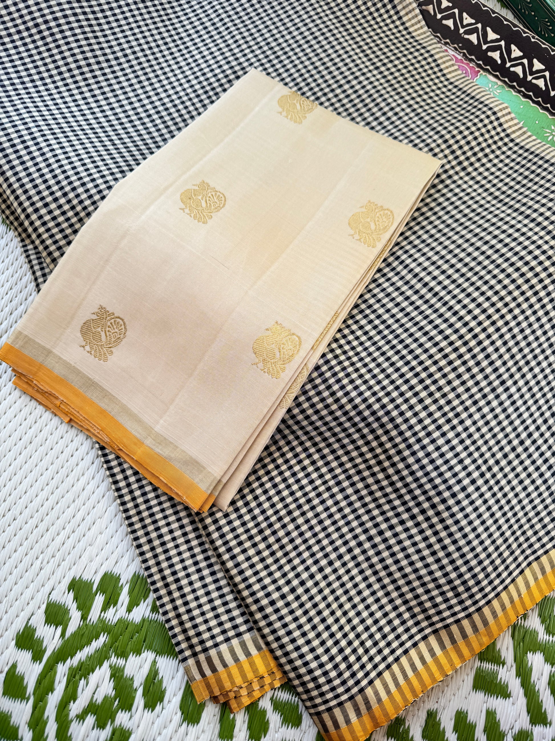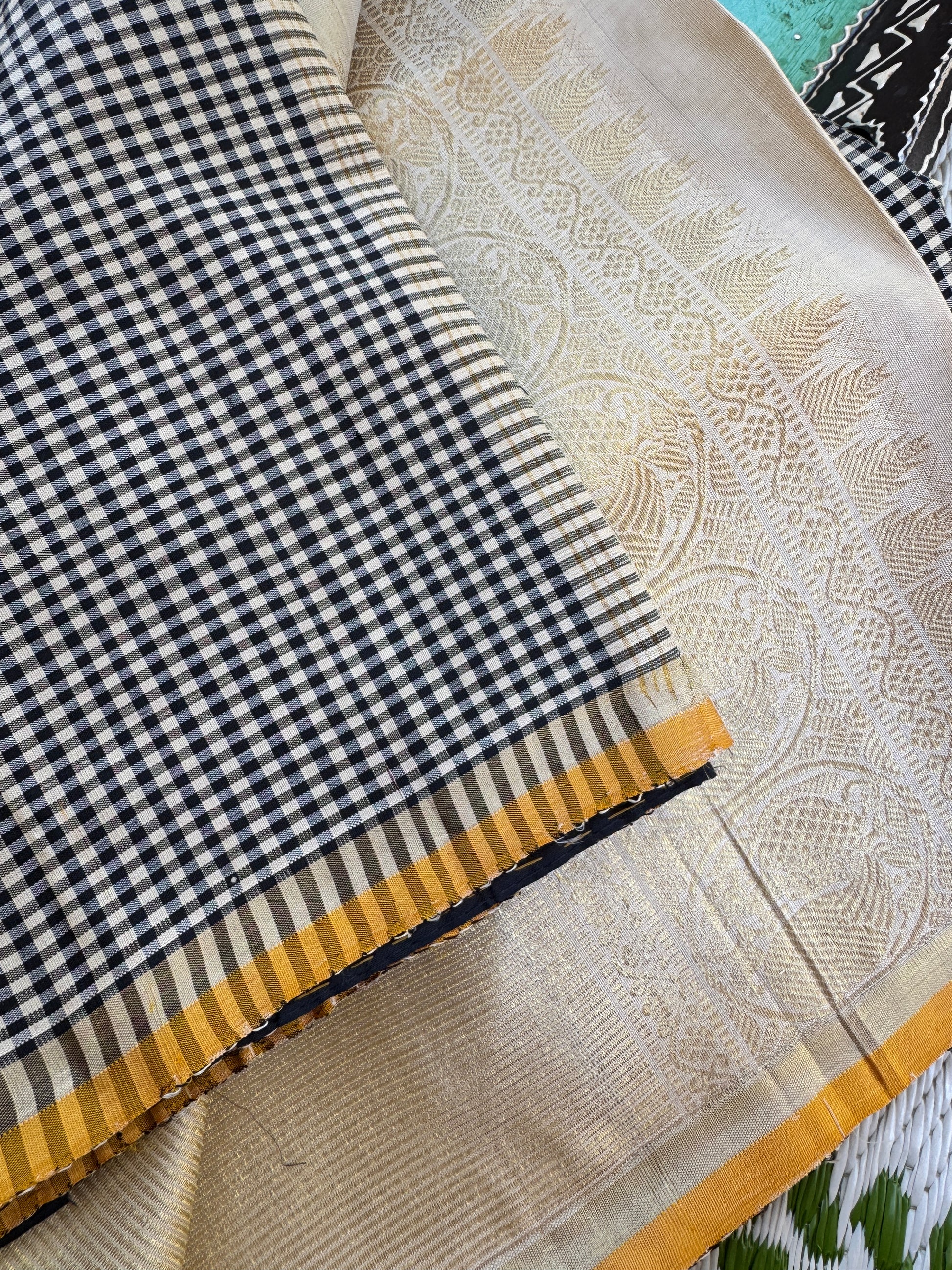 A classy korvai Kanjivaram silk with muthukattam, buttas and a beautiful pallu. Woven in pure silk and zari