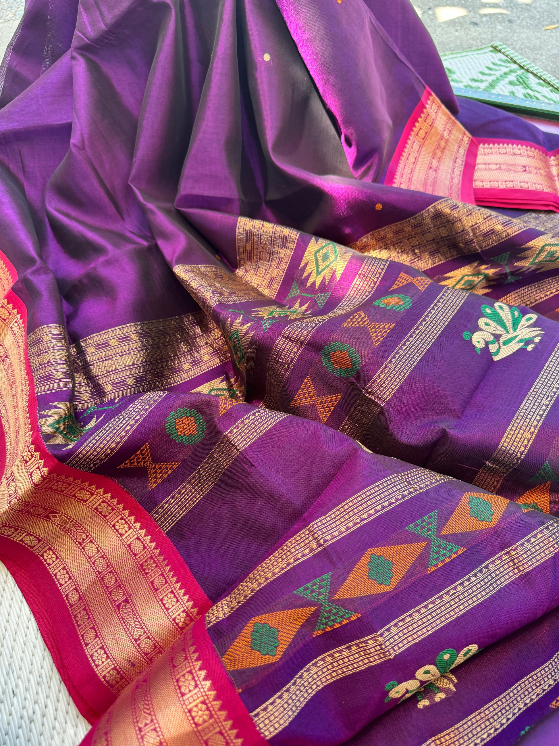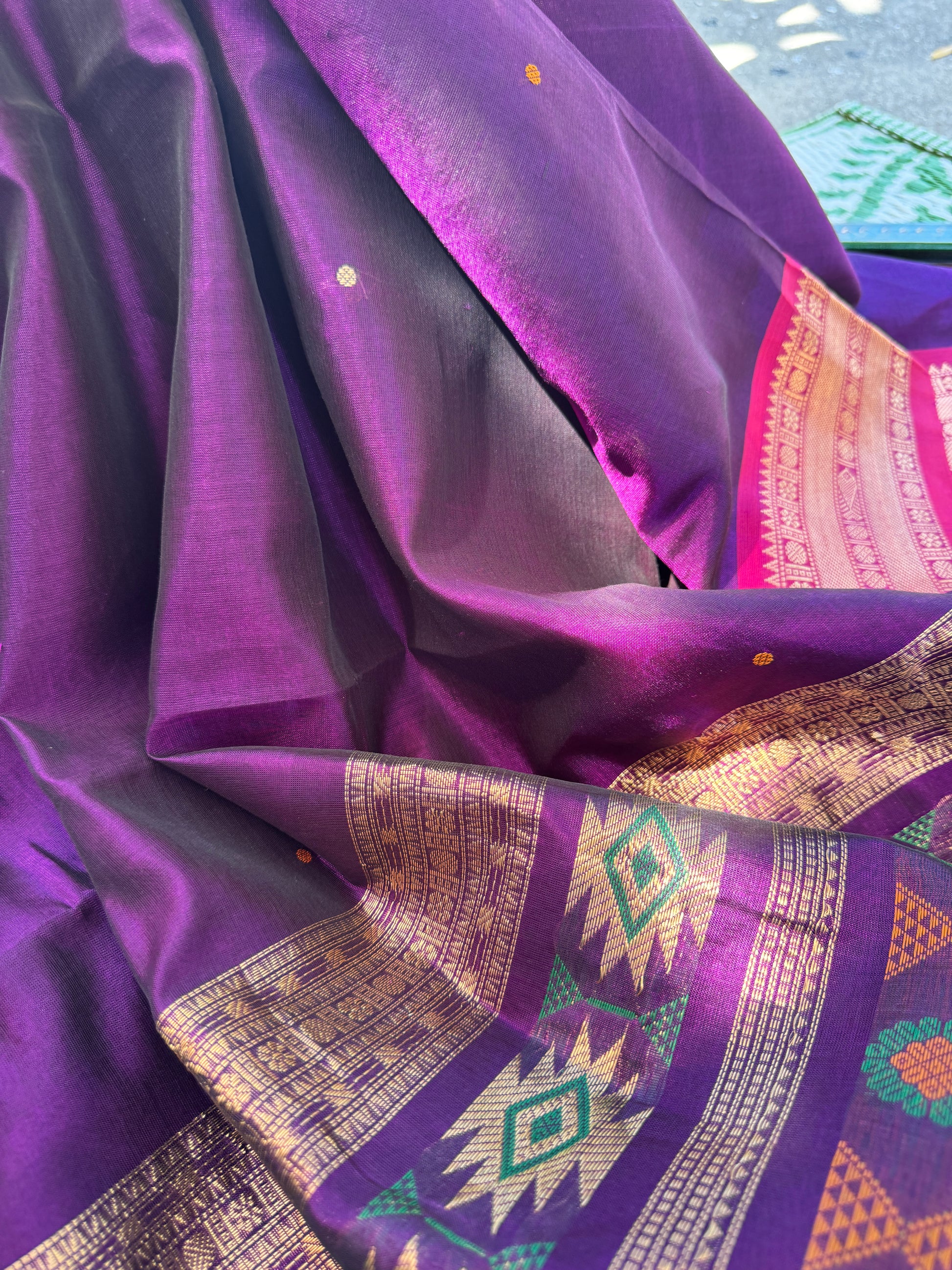 Handwoven Silk by cotton saree in eggplant purple color with silken kamalam motifs and exquisite pallu with Orissa bomkai inspired motifs in zari and silk
