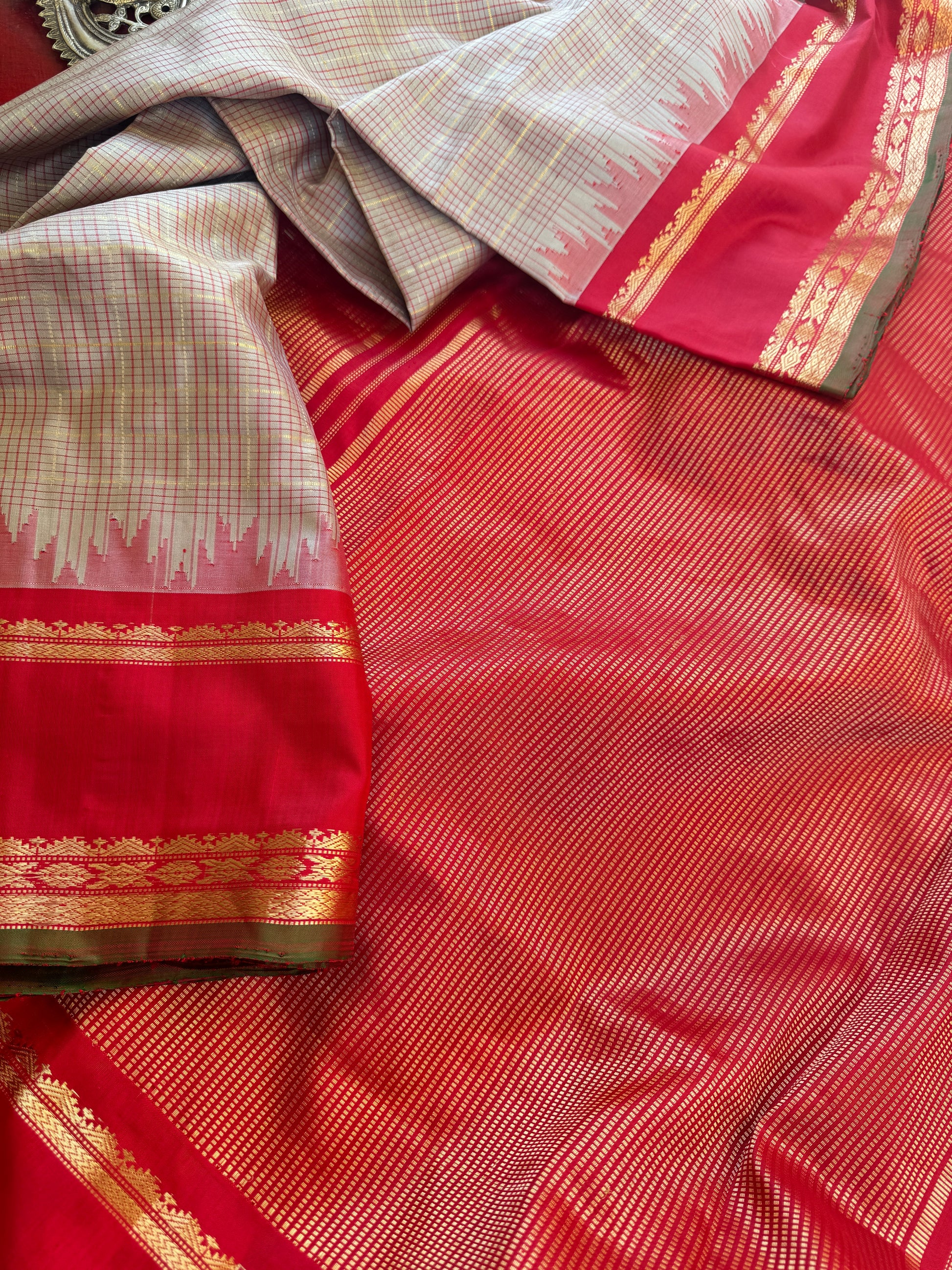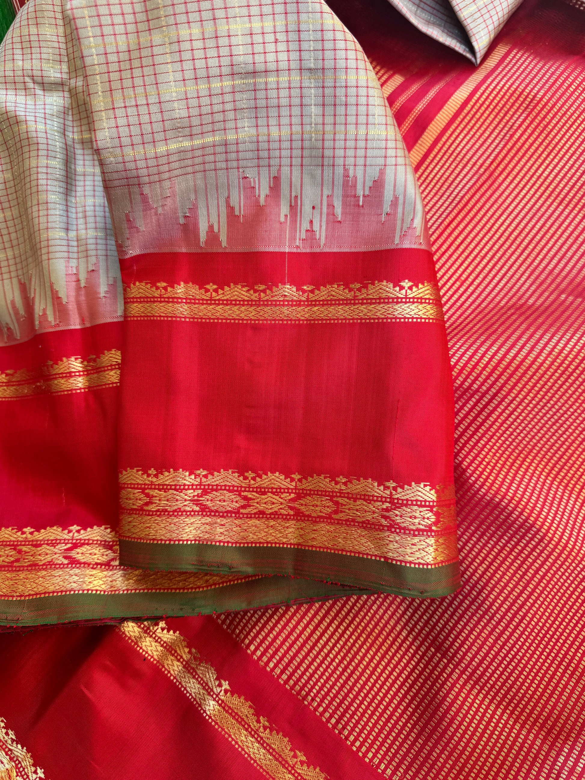 A classy handwoven kuttu Gadwal silk in golden beige color with silk and zari checks contrasted by kuttu/interloced borders in red. Woven in pure silk