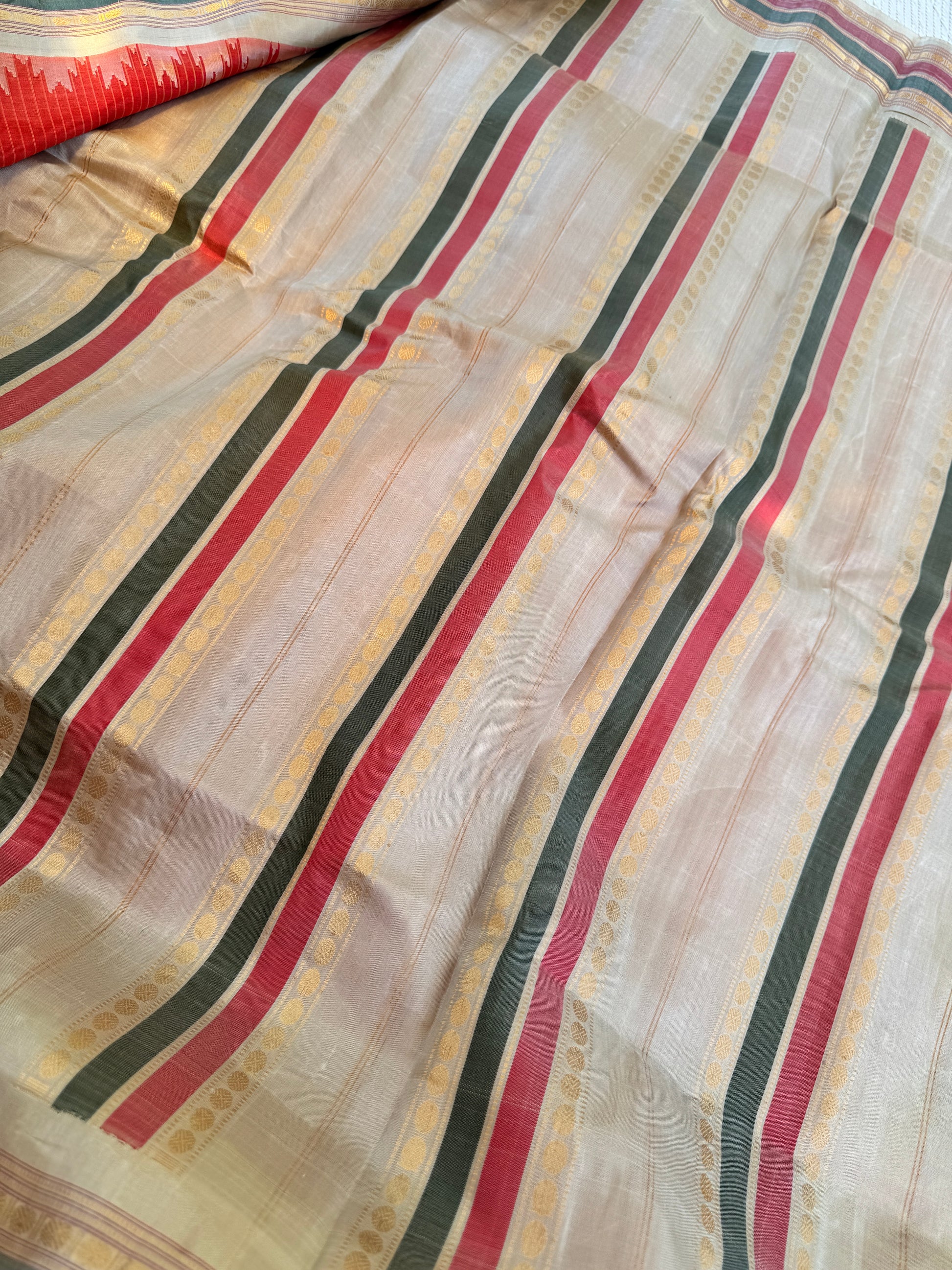 A classy handwoven kuttu Gadwal in original style with cotton body (rust orange) and silk borders, pallu and blouse (muted powder pastel mint green). Temple borders and zari motifs.