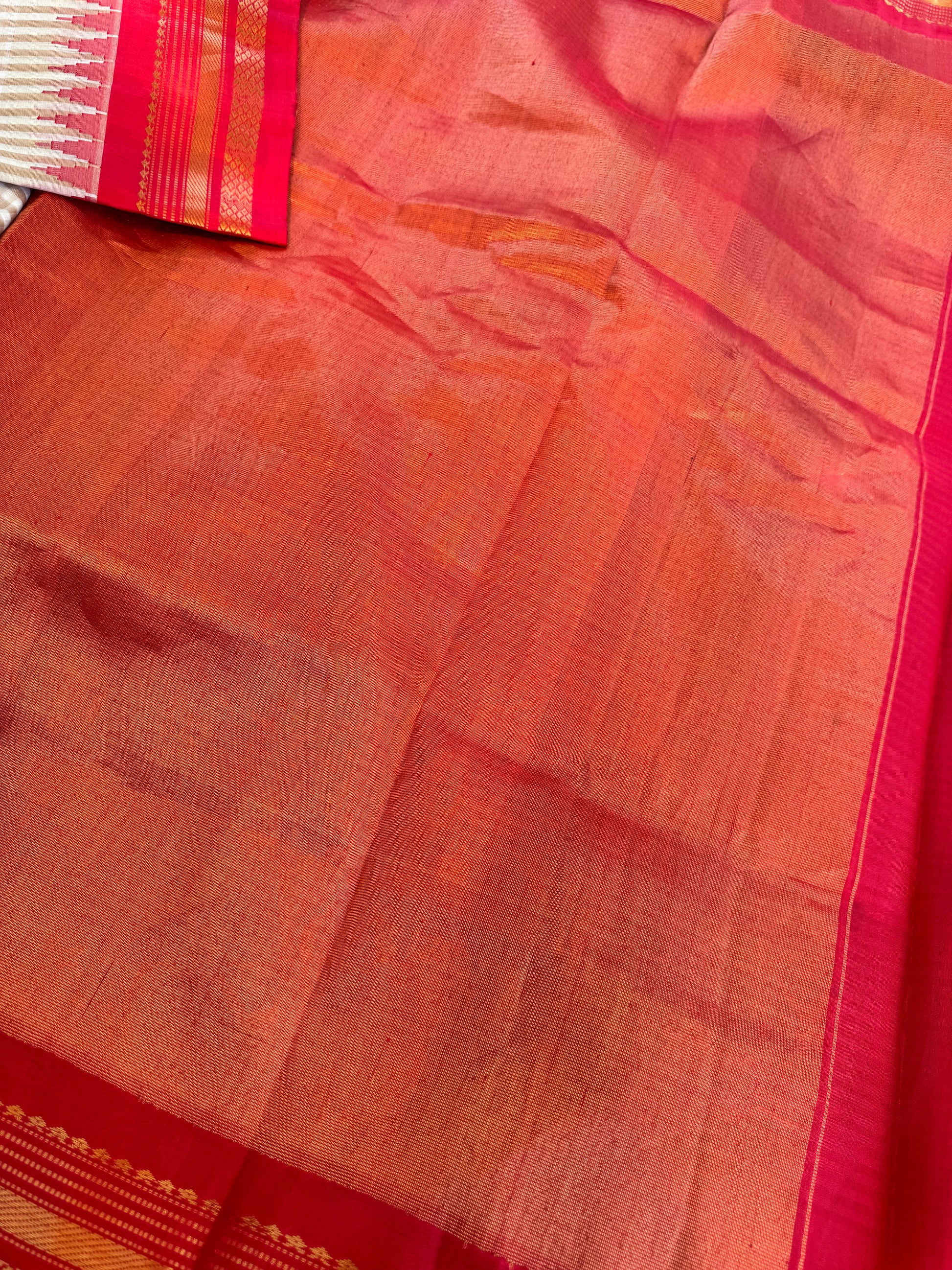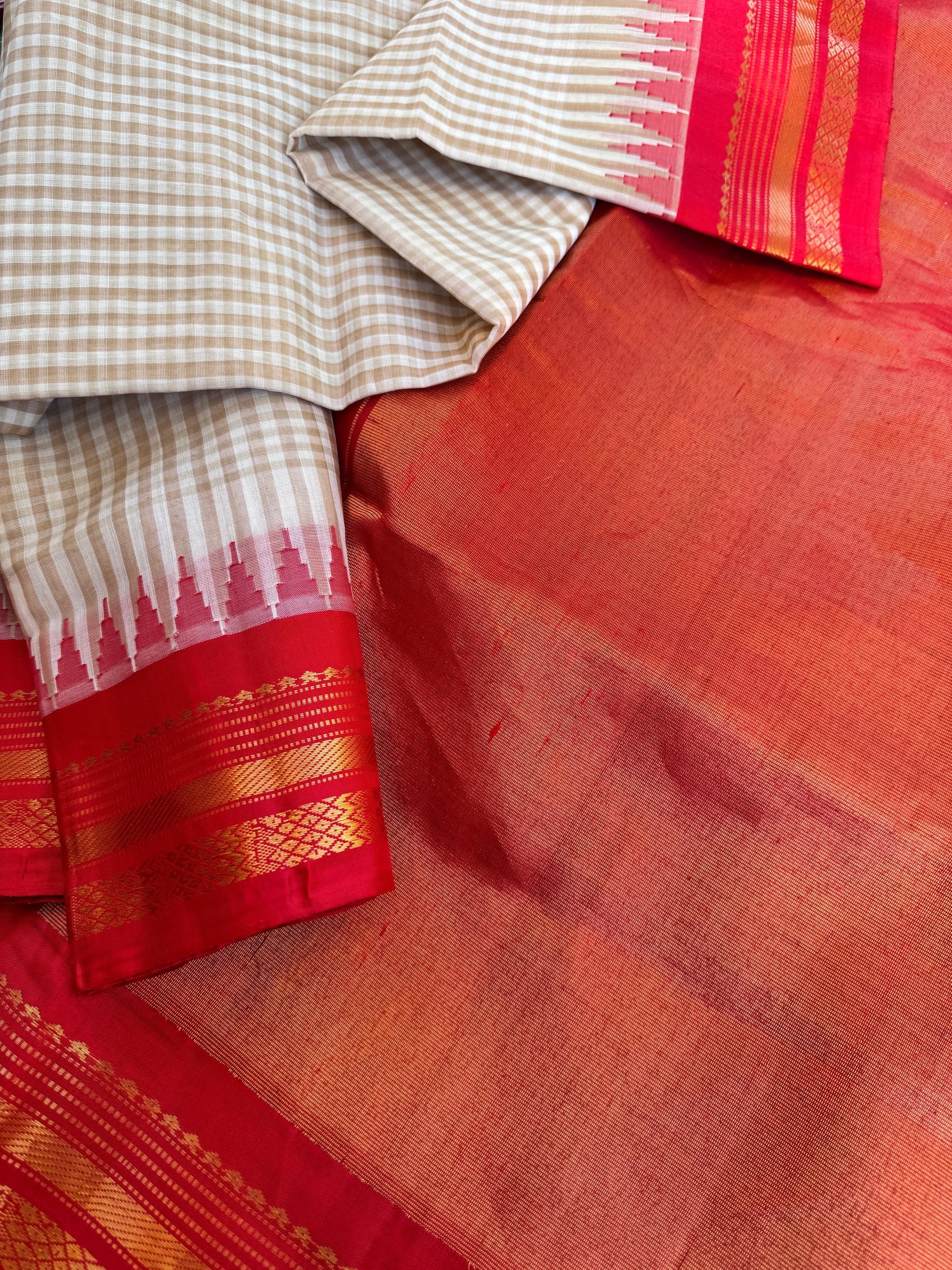 A classy handwoven kuttu Gadwal in original style with cotton body (ivory & khakhi colors crossing to form checks) and silk borders, pallu and blouse (red). Temple borders and zari stripes