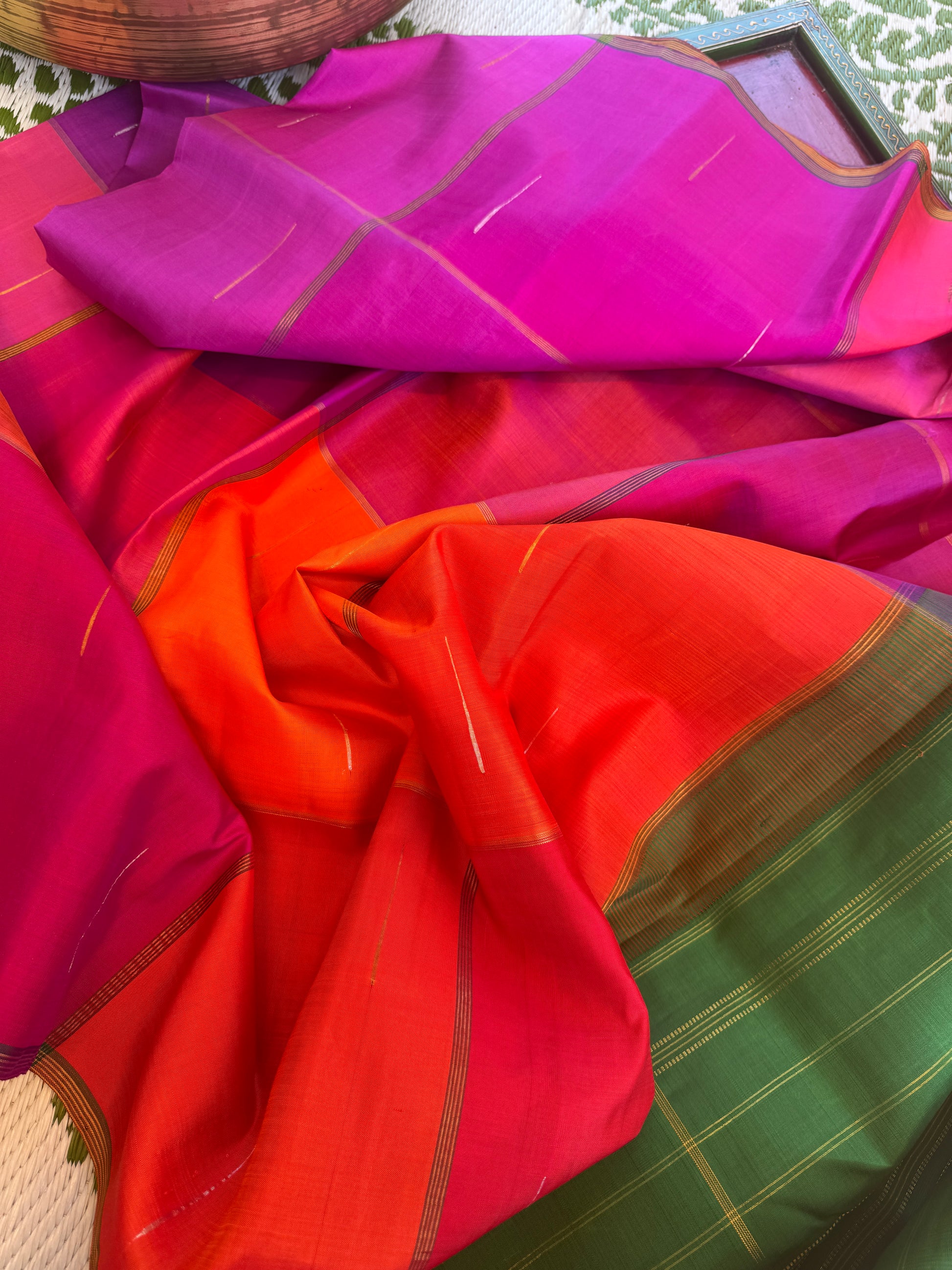A beautiful paalum pazhamum - mutlicolor checks with zari checks with mallimoggu patterns on the squares and a contrast pallu in green with seer lines and seepu rekku