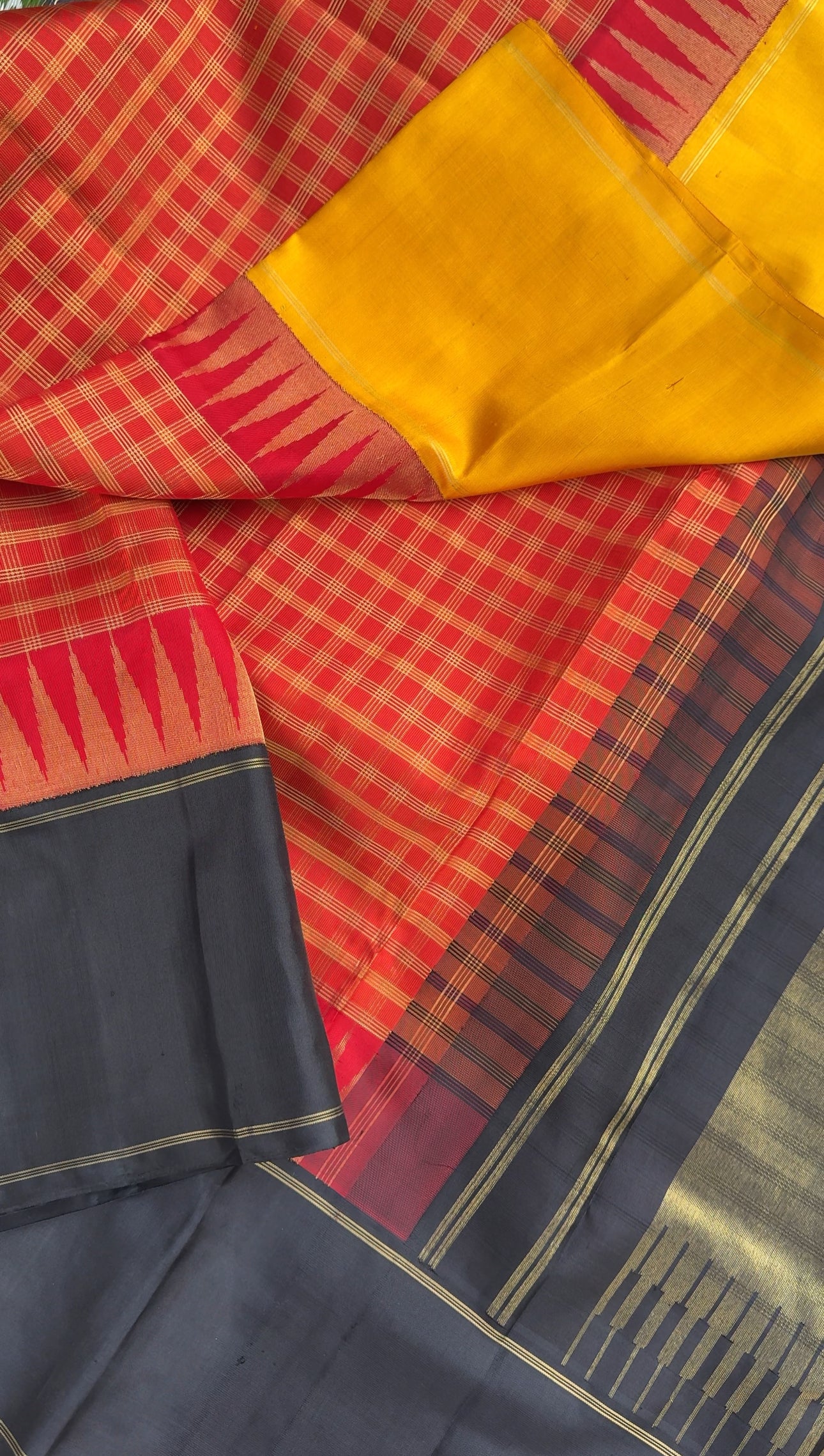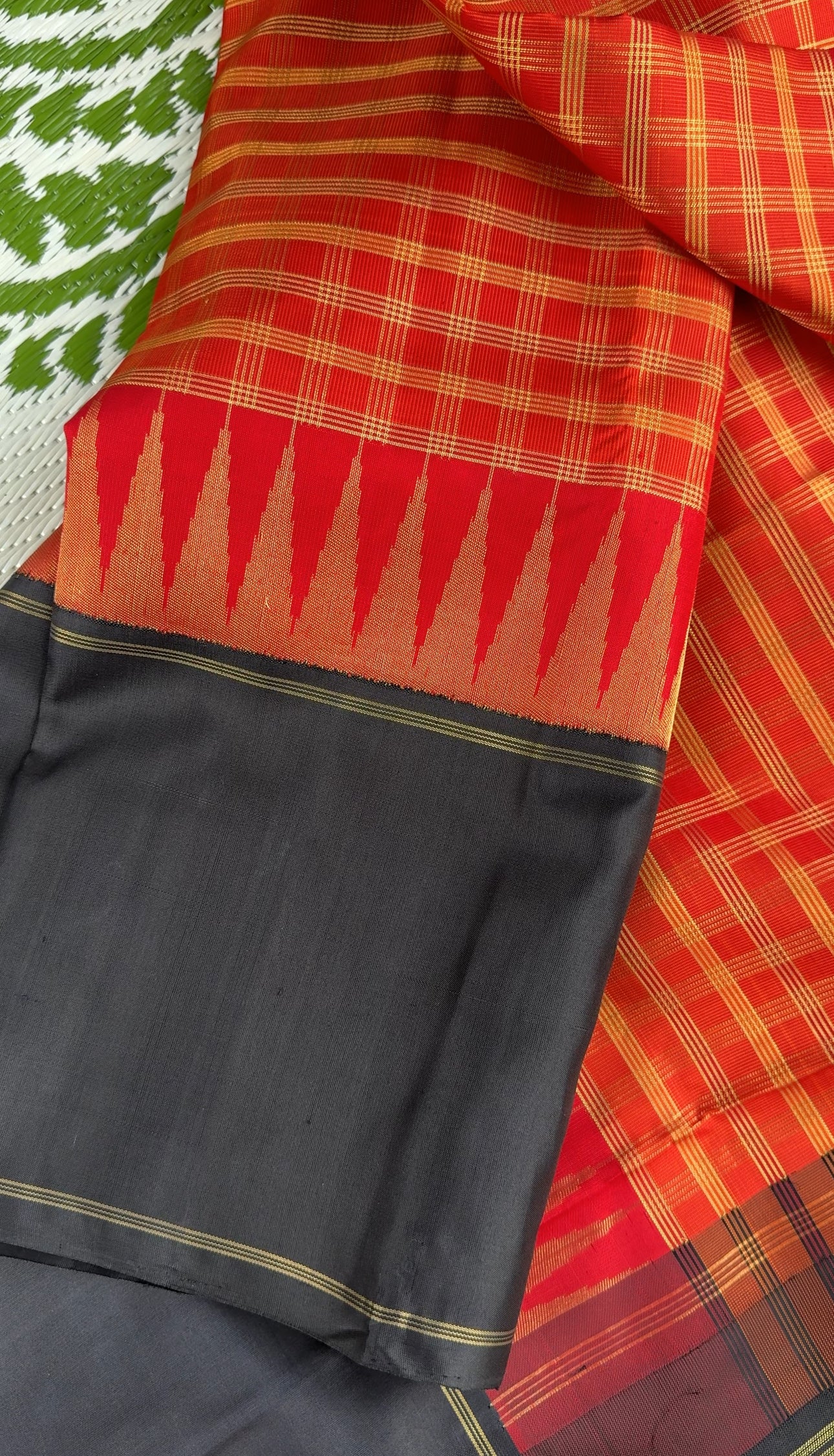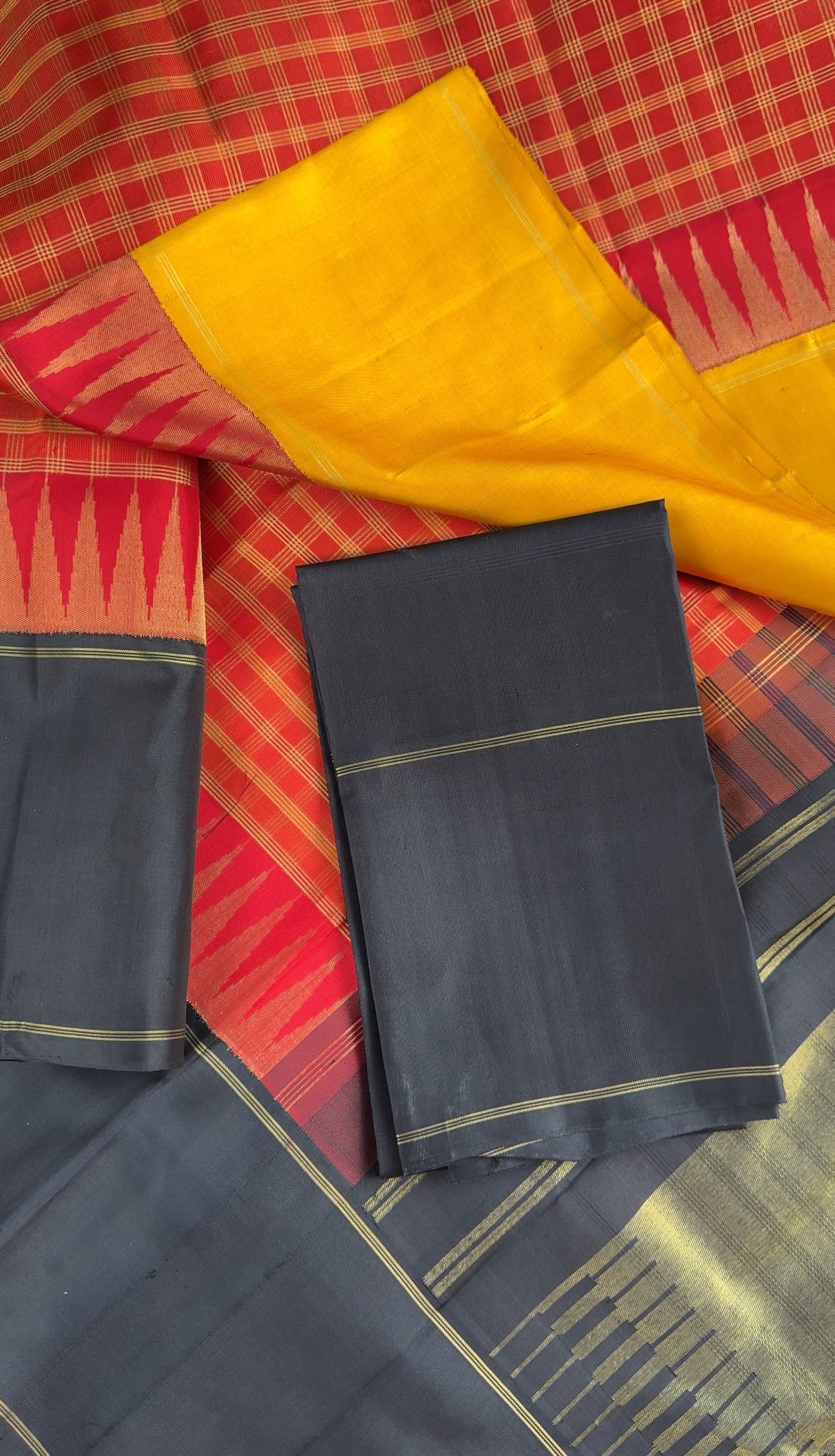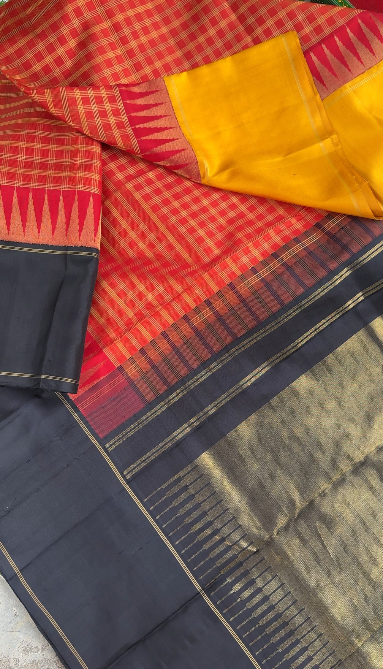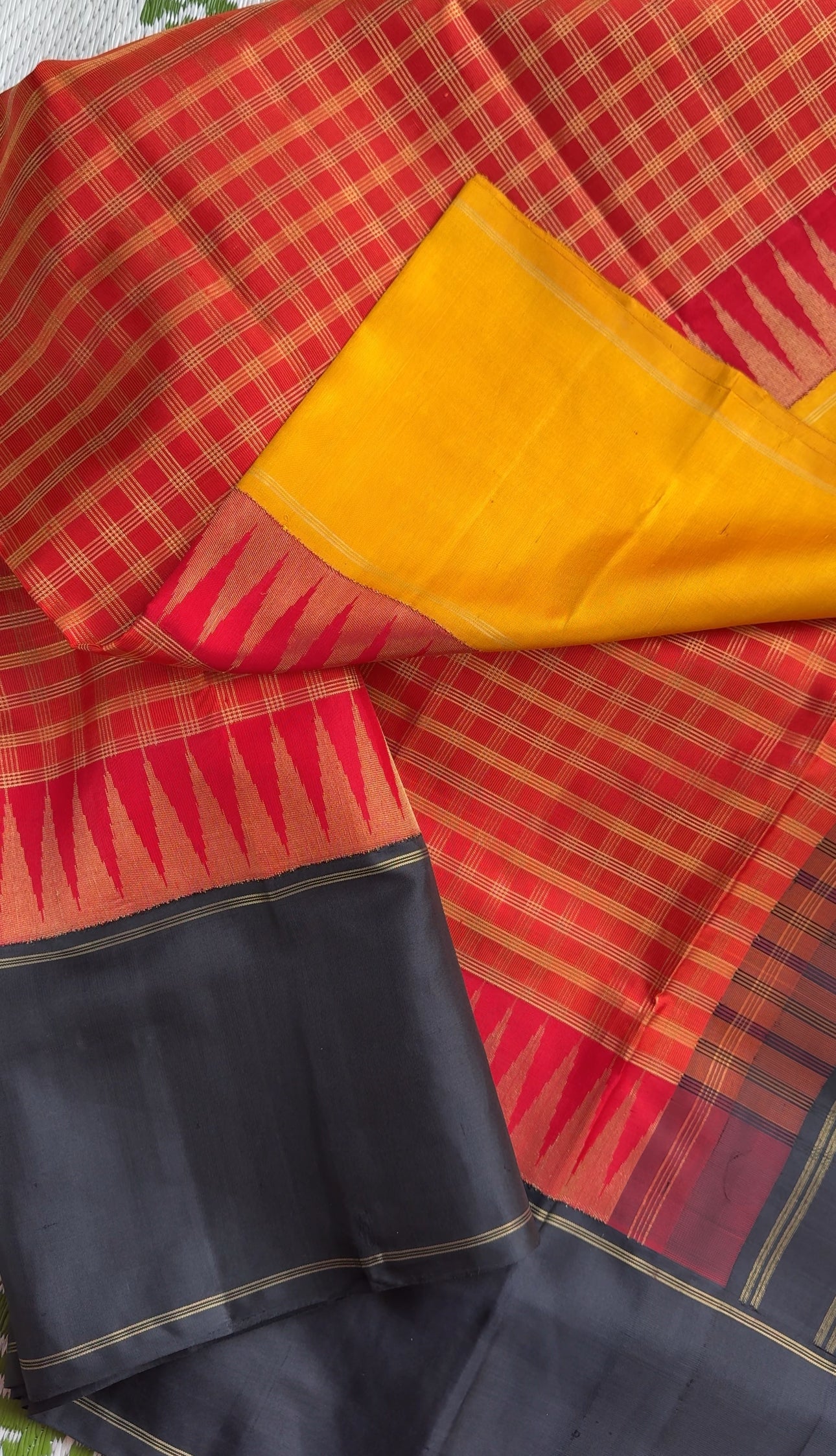A classy zarigai kattam (with 4 lines) in old rust shade on the body with Ganga Jamuna borders in mustard and black with zari temples woven along the borders. This is woven in pure silk and zari .