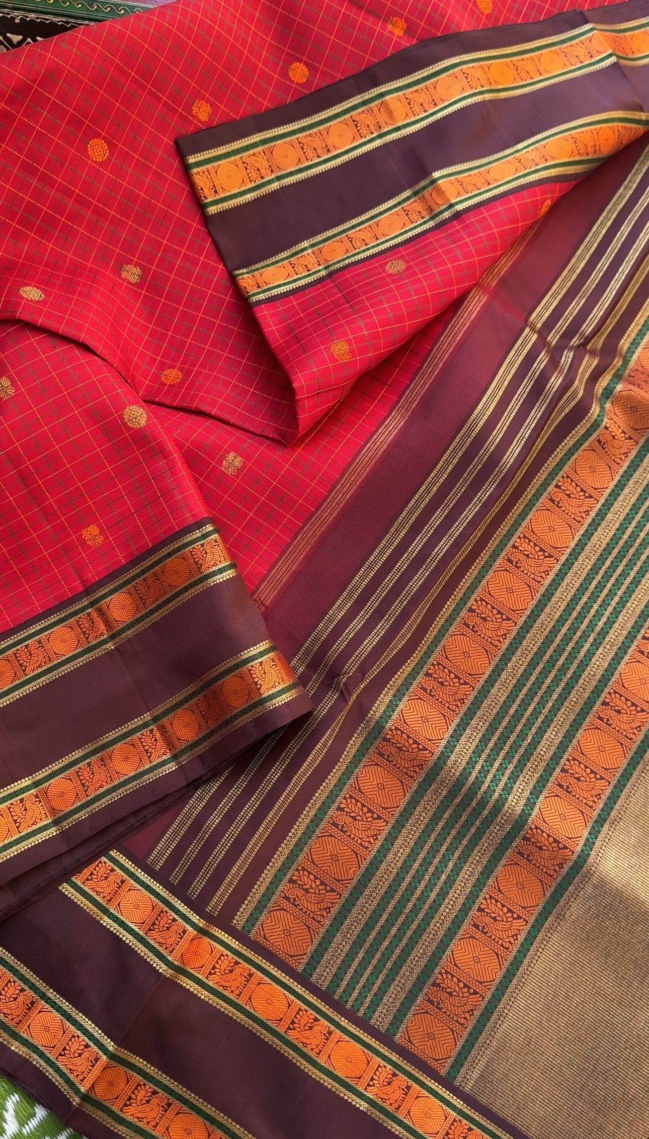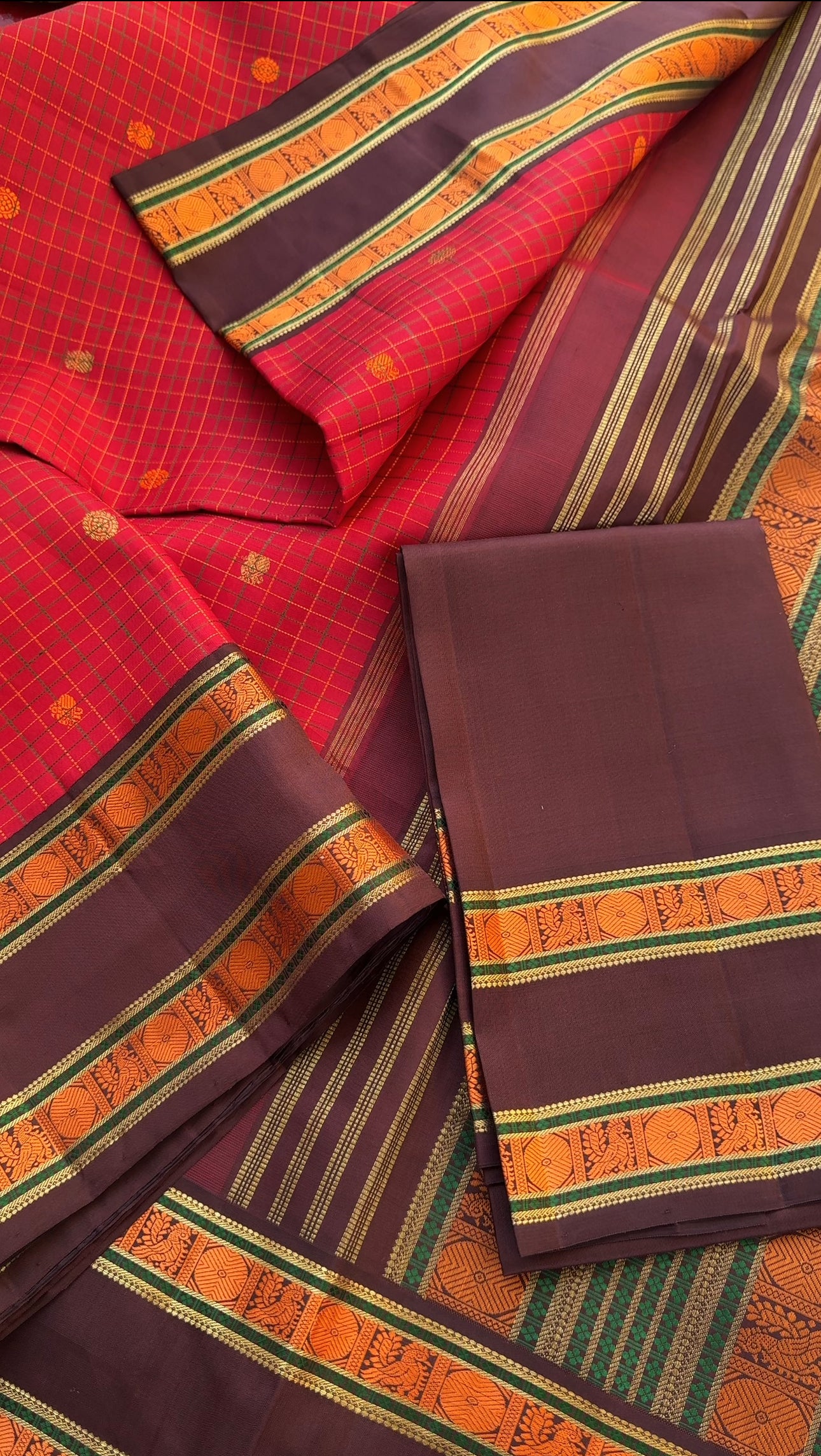 A classy korvai Kanjivaram silk with muthukattam, buttas and a beautiful pallu. Woven in pure silk and zari