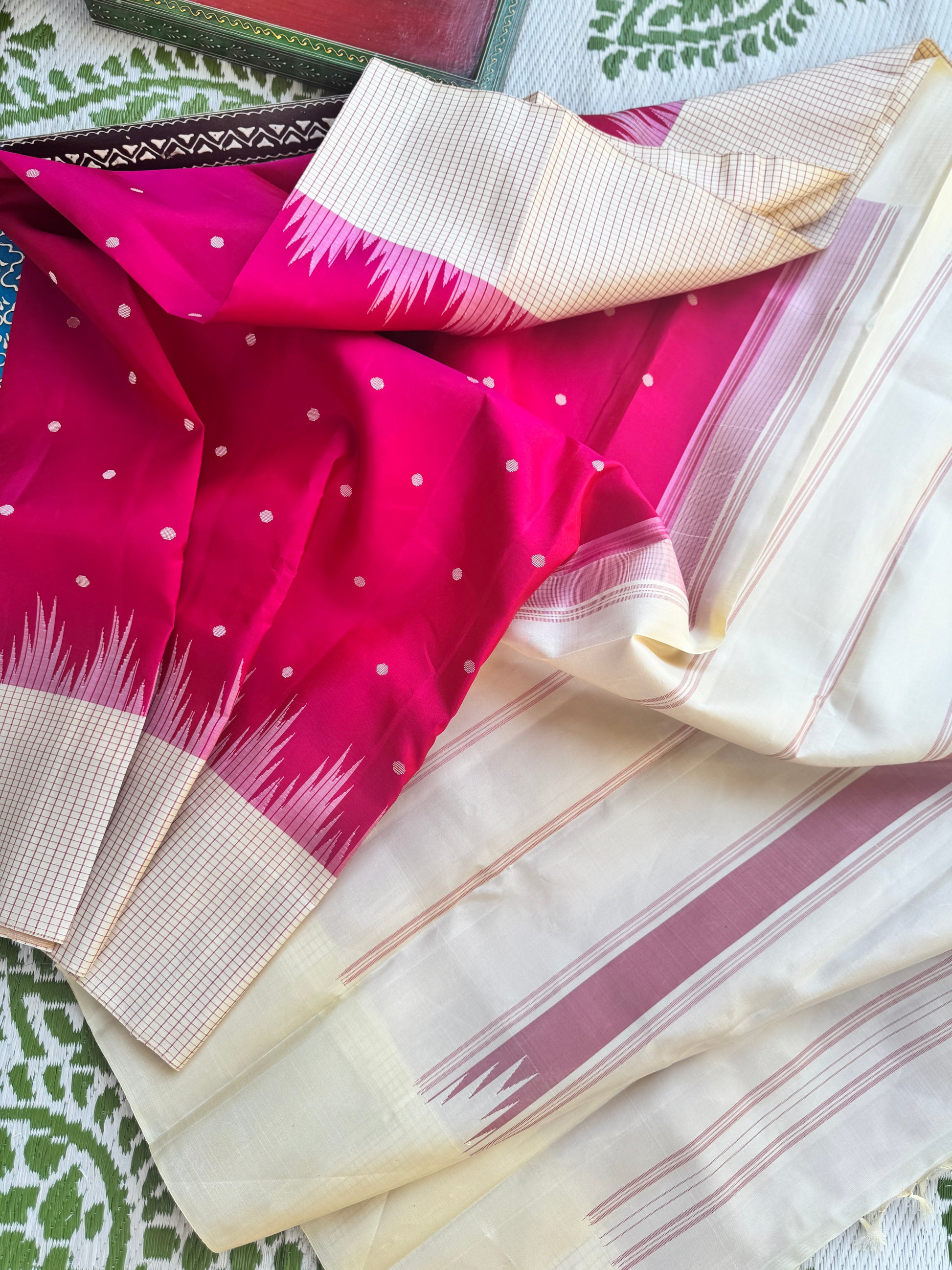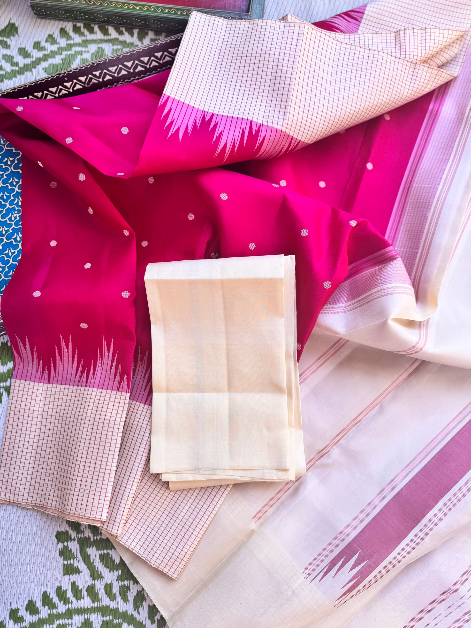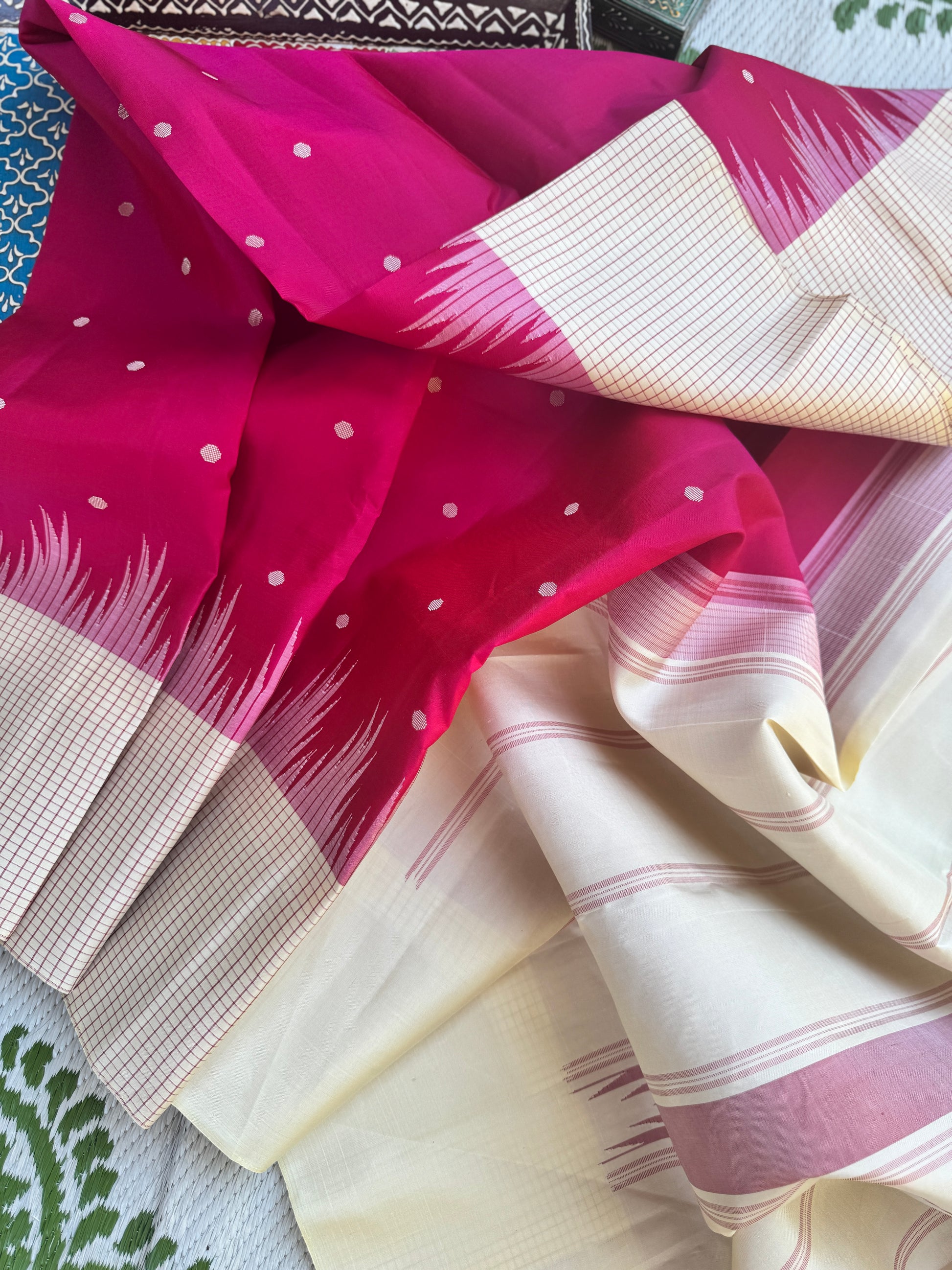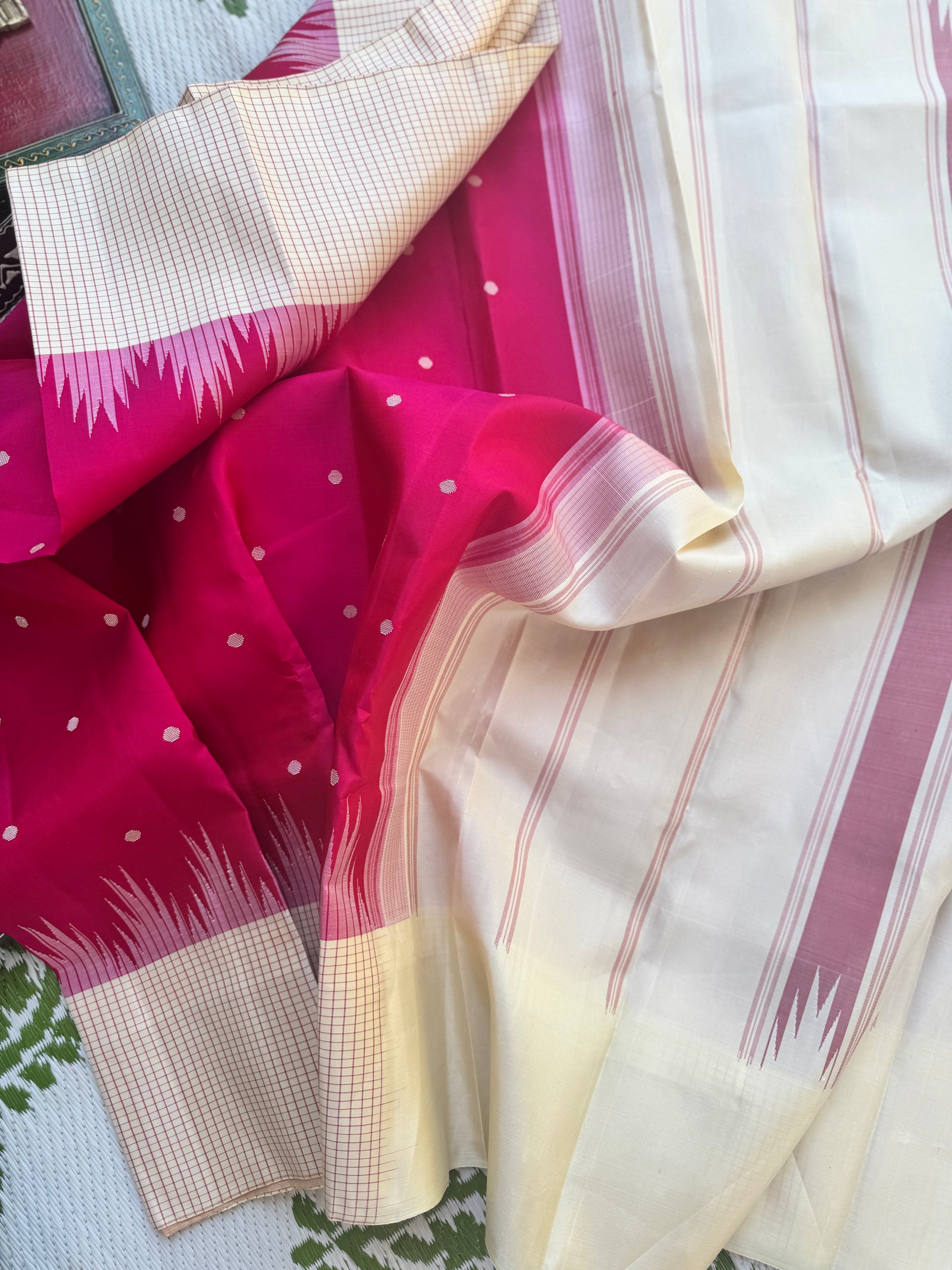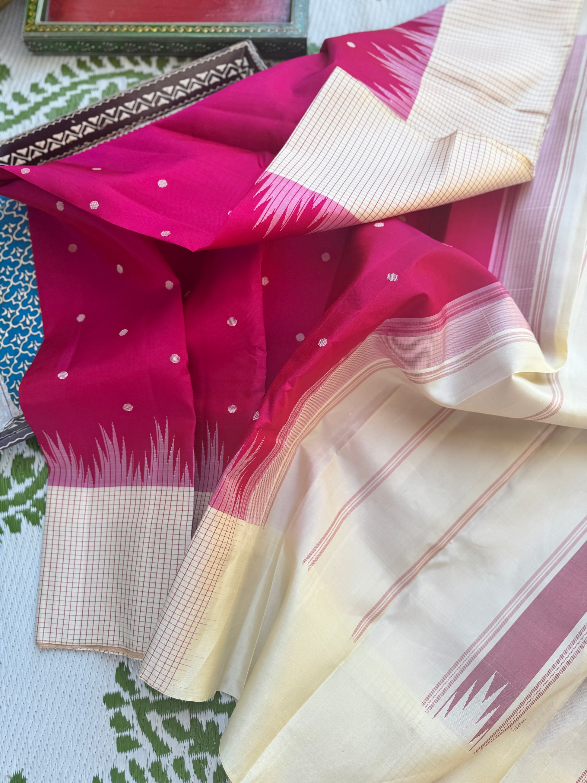 A beautiful handwoven Korvai Kanjivaram silk in a classy fuchsia pink with pattani buttas contrasted by Korvai borders in ivory shade with checks and temples and a simpler pallu. What a classy one this is! Walk in confidently to your meetings,conferences and anywhere else where you want to flaunt traditional sophistication.