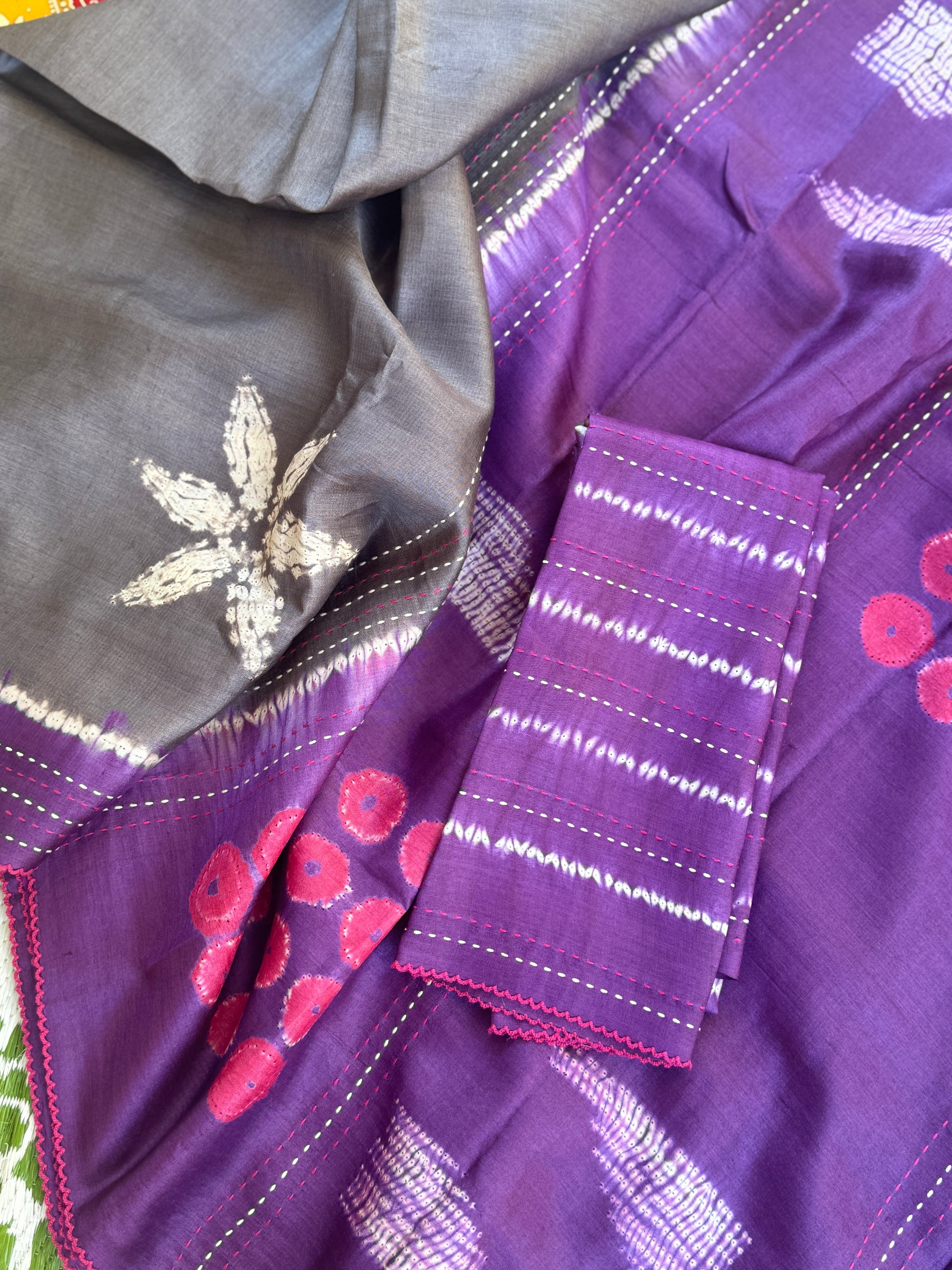 A beautiful handcrafted Nui Shibori and kantha stitches on a woven tussar. Color is grey and purple. Colorful tassels are attached.