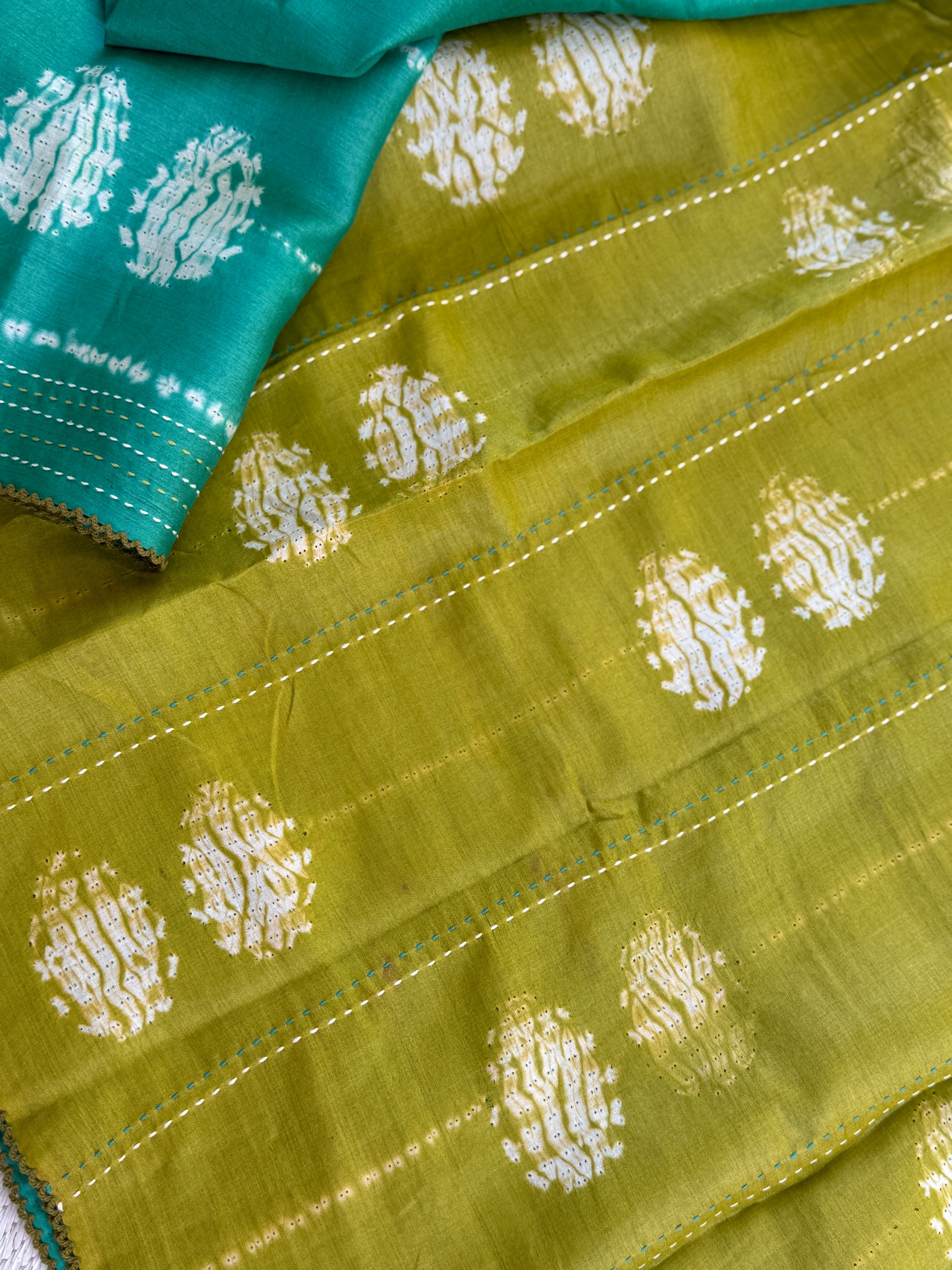 A beautiful handcrafted Nui Shibori and kantha stitches on a woven tussar. Color is Sea green and chartreuse. Colorful tassels are attached.
