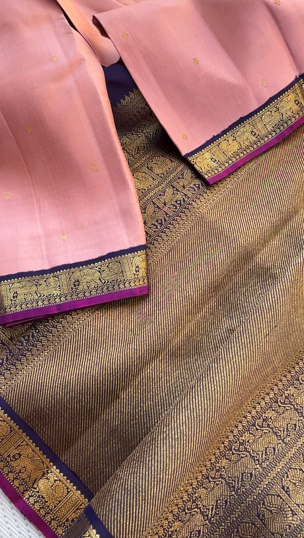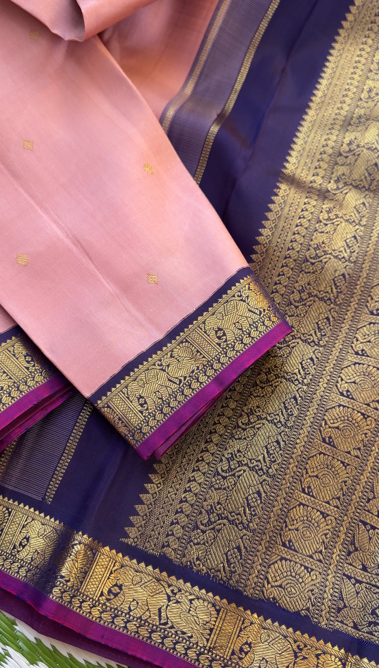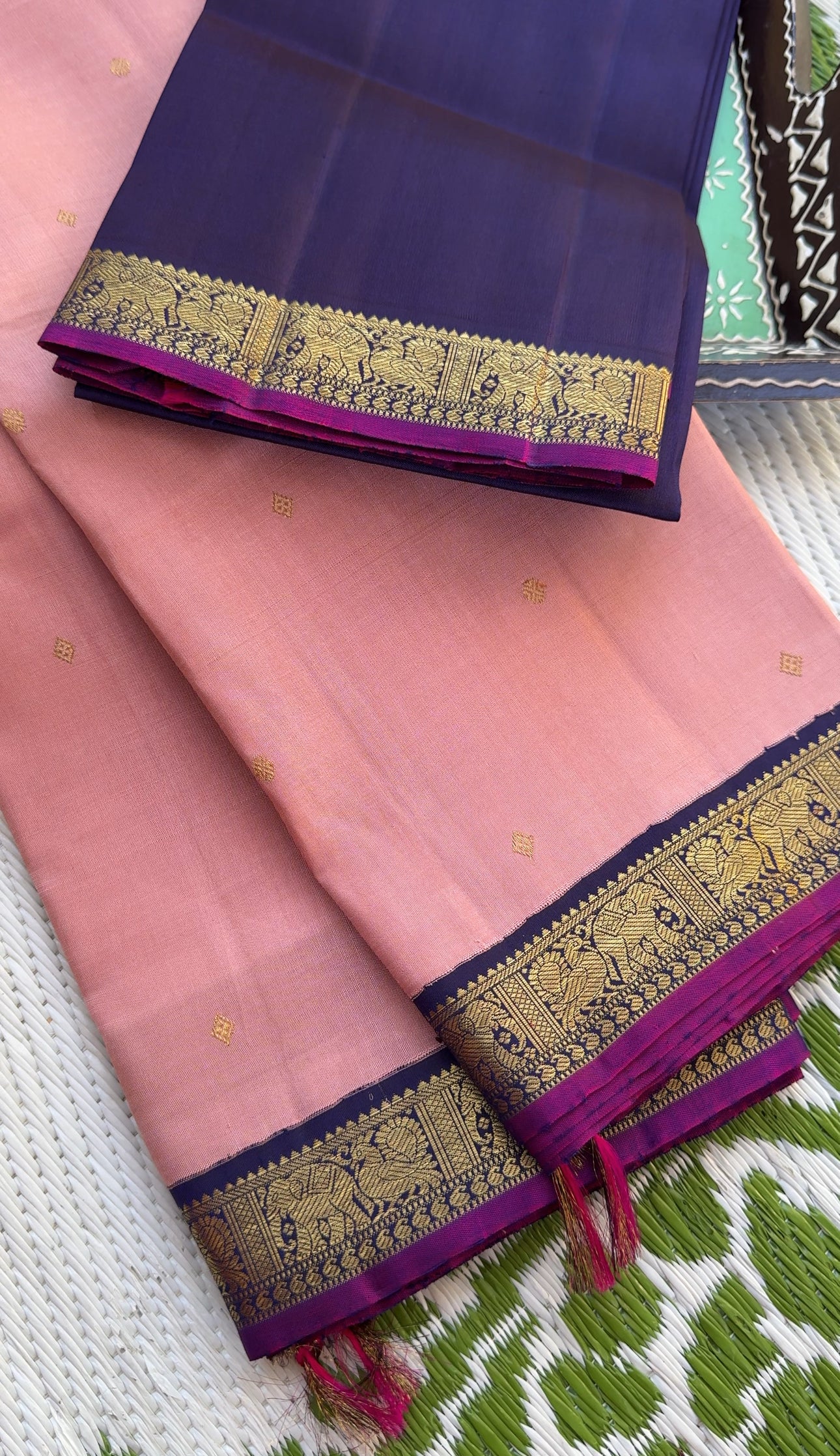 A beautiful handwoven Korvai Kanjivaram silk in geva with kamalam + diamond zari buttas contrasted by korvai borders in eggplant purple. This is a pure silk, pure zari Kanjivaram silk.