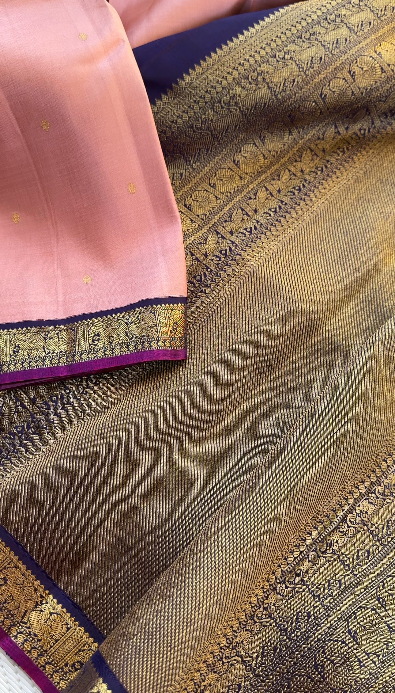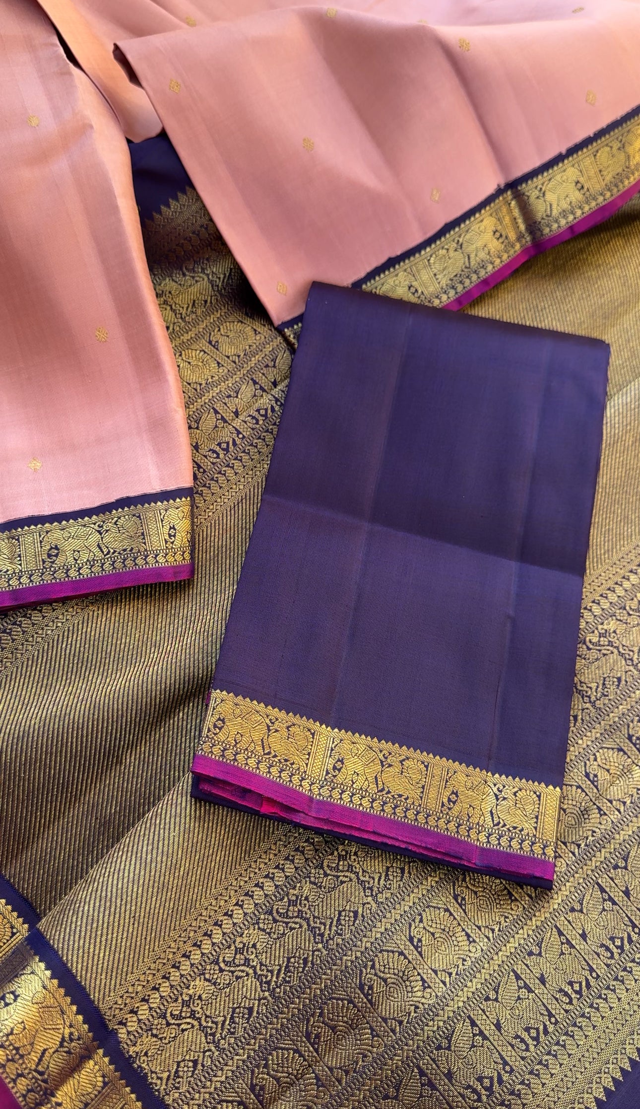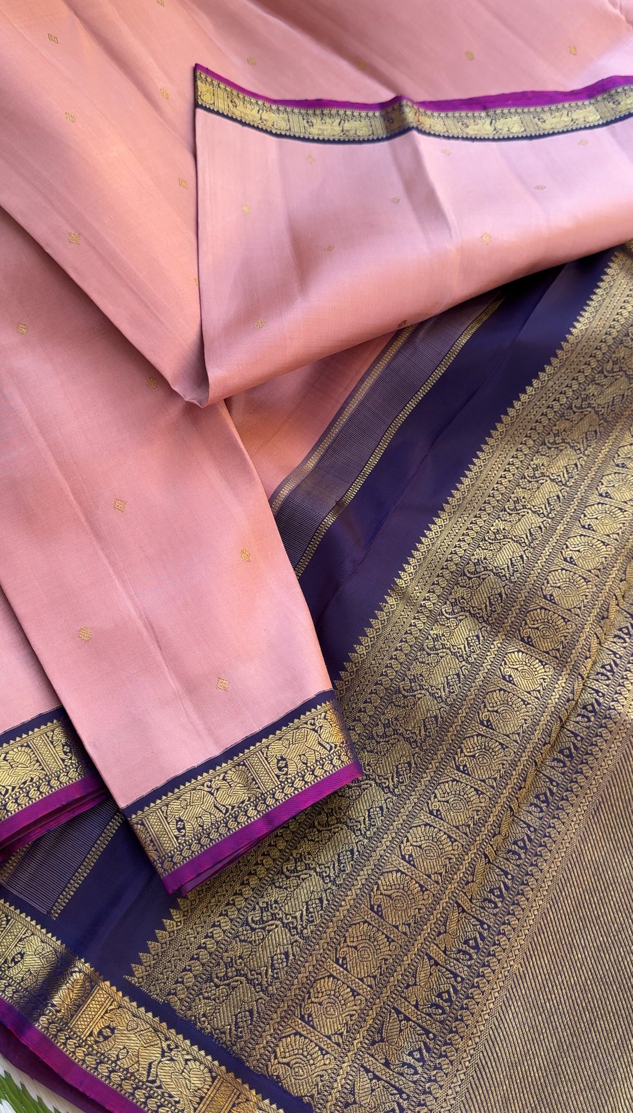 A beautiful handwoven Korvai Kanjivaram silk in geva with kamalam + diamond zari buttas contrasted by korvai borders in eggplant purple. This is a pure silk, pure zari Kanjivaram silk.