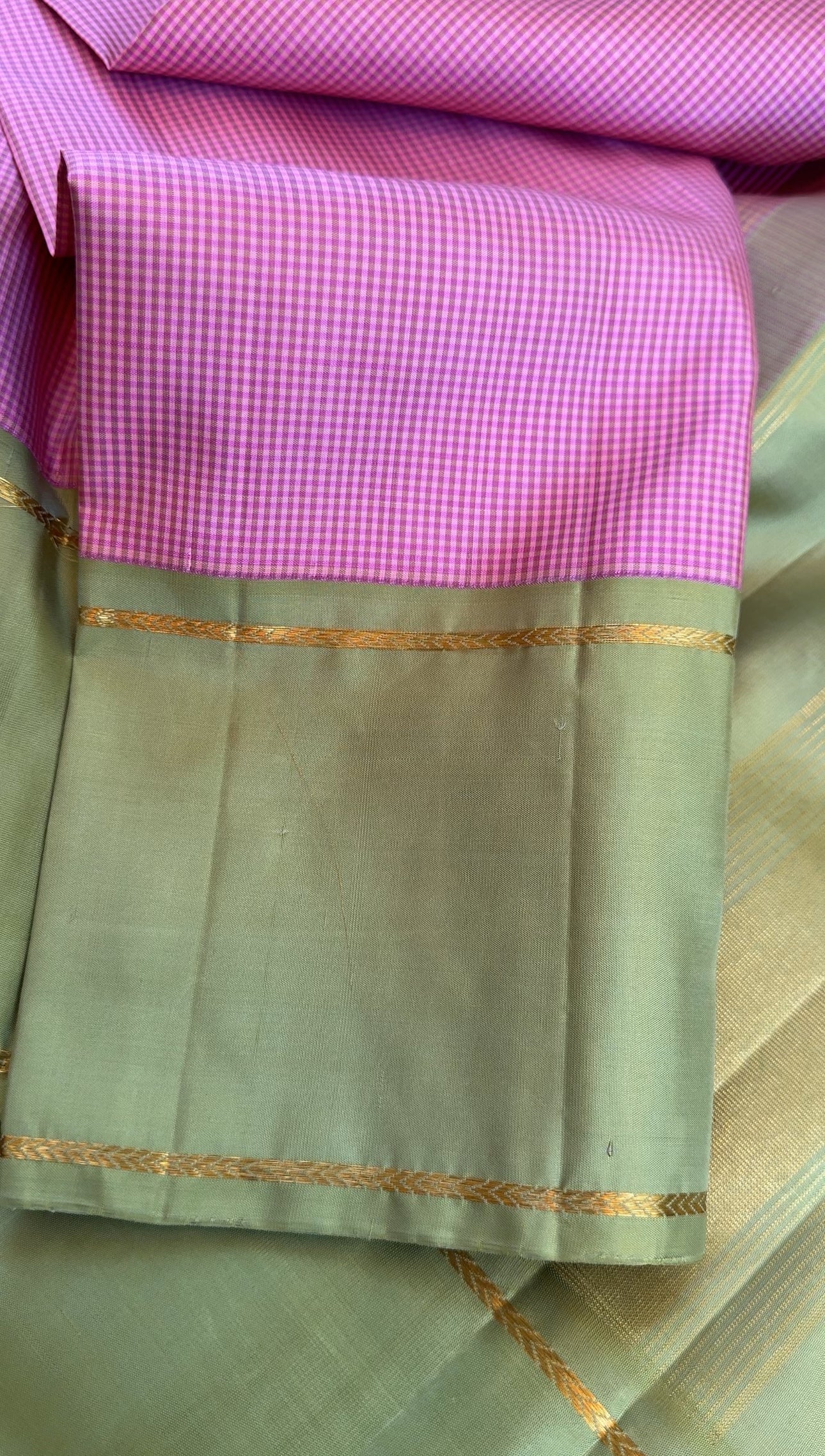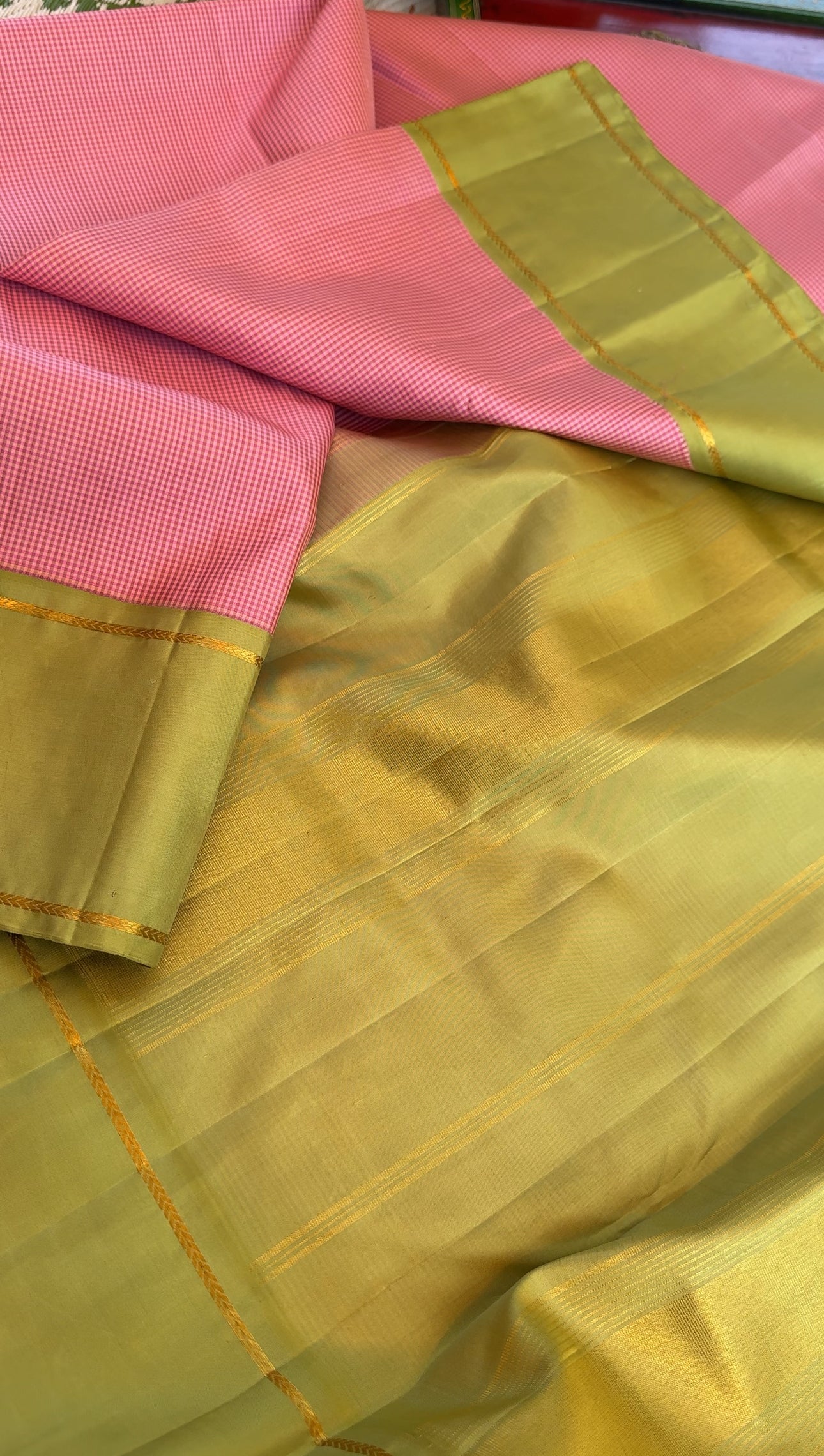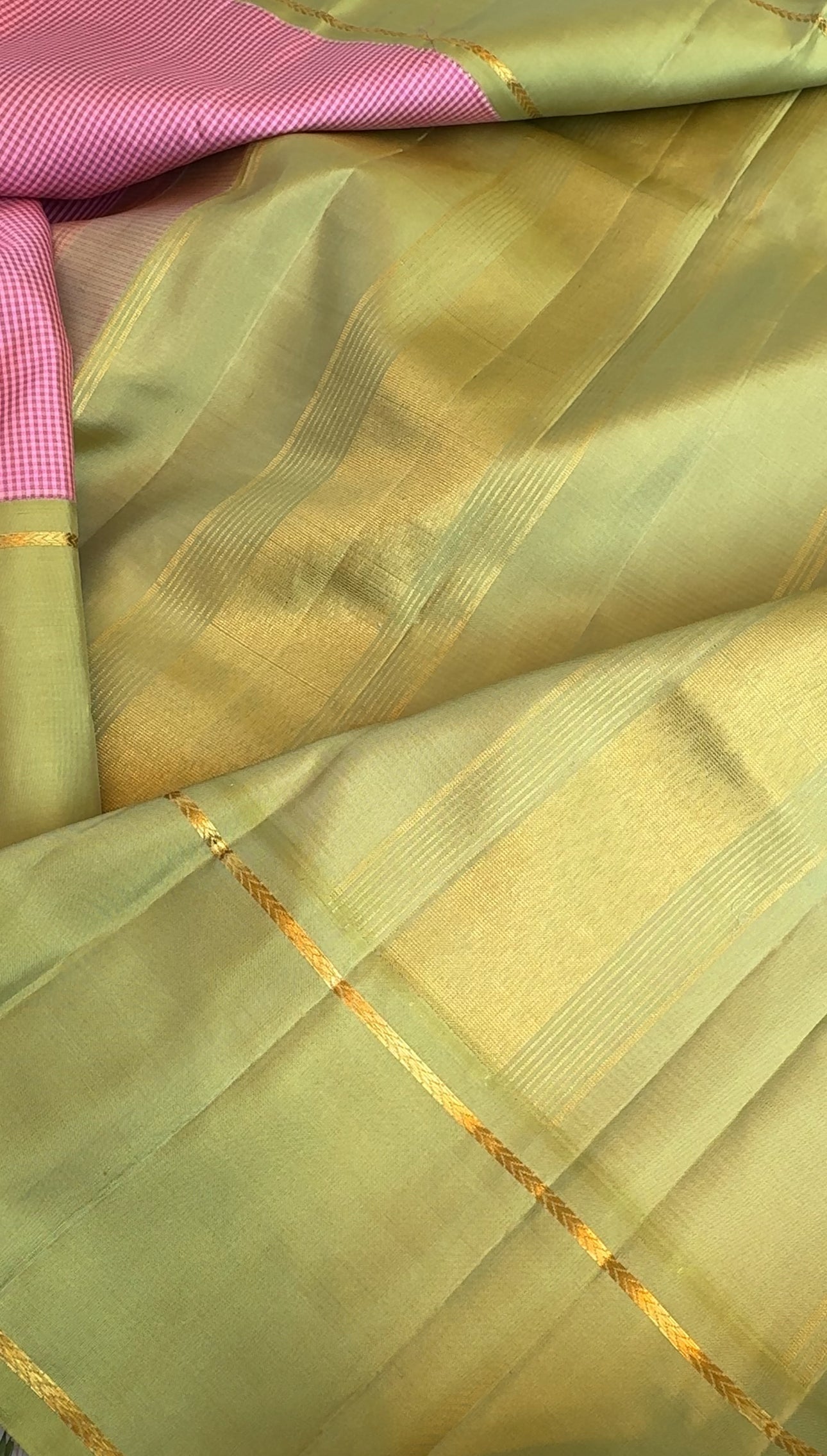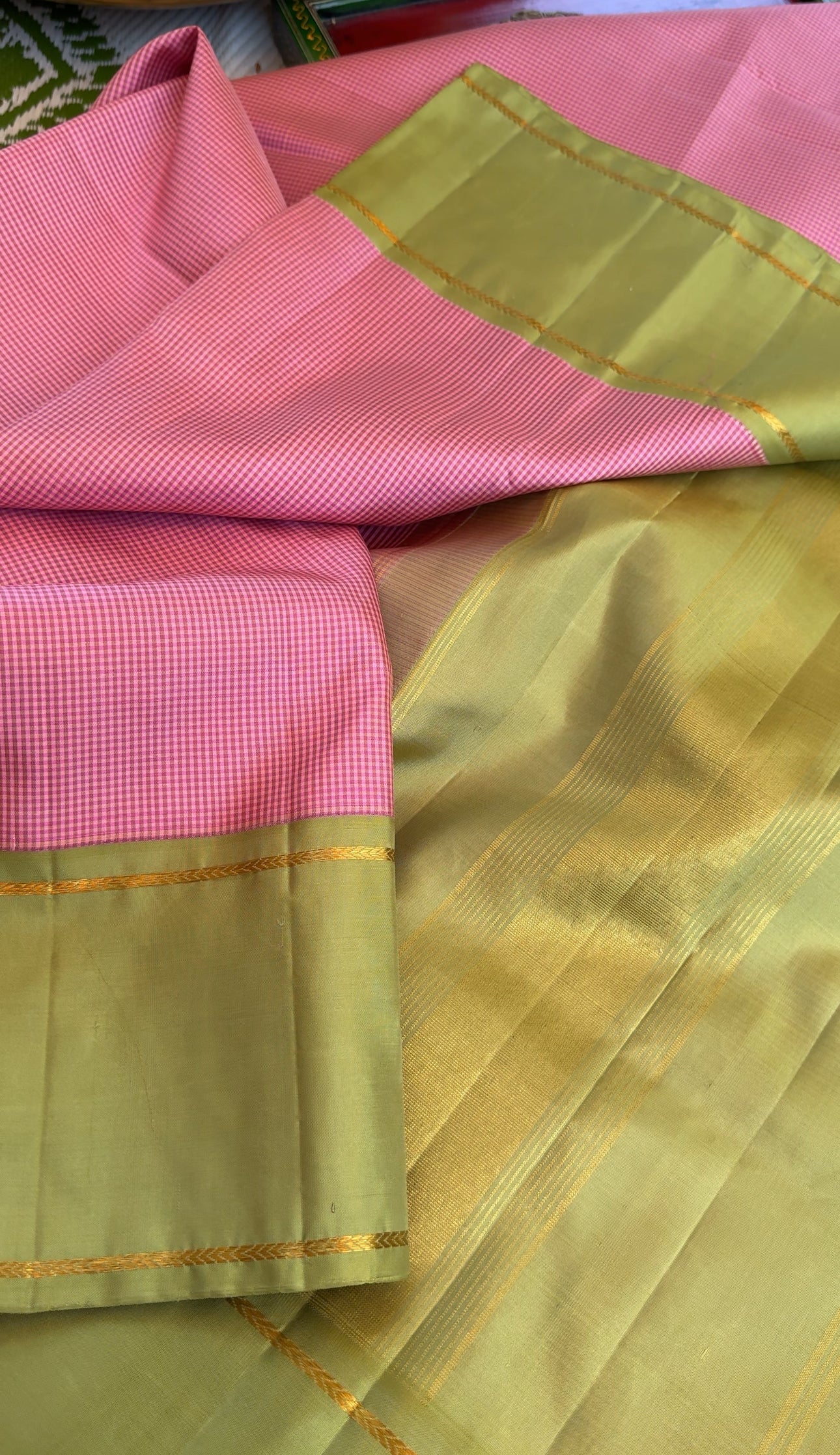 A classy handwoven vintage style podi kattam (micro checks) with ivory and pink colors crossing to form tiny checks/kattam contrasted by interlocked korvai borders in apple green with zarigai motifs. Woven with pure silk and zari