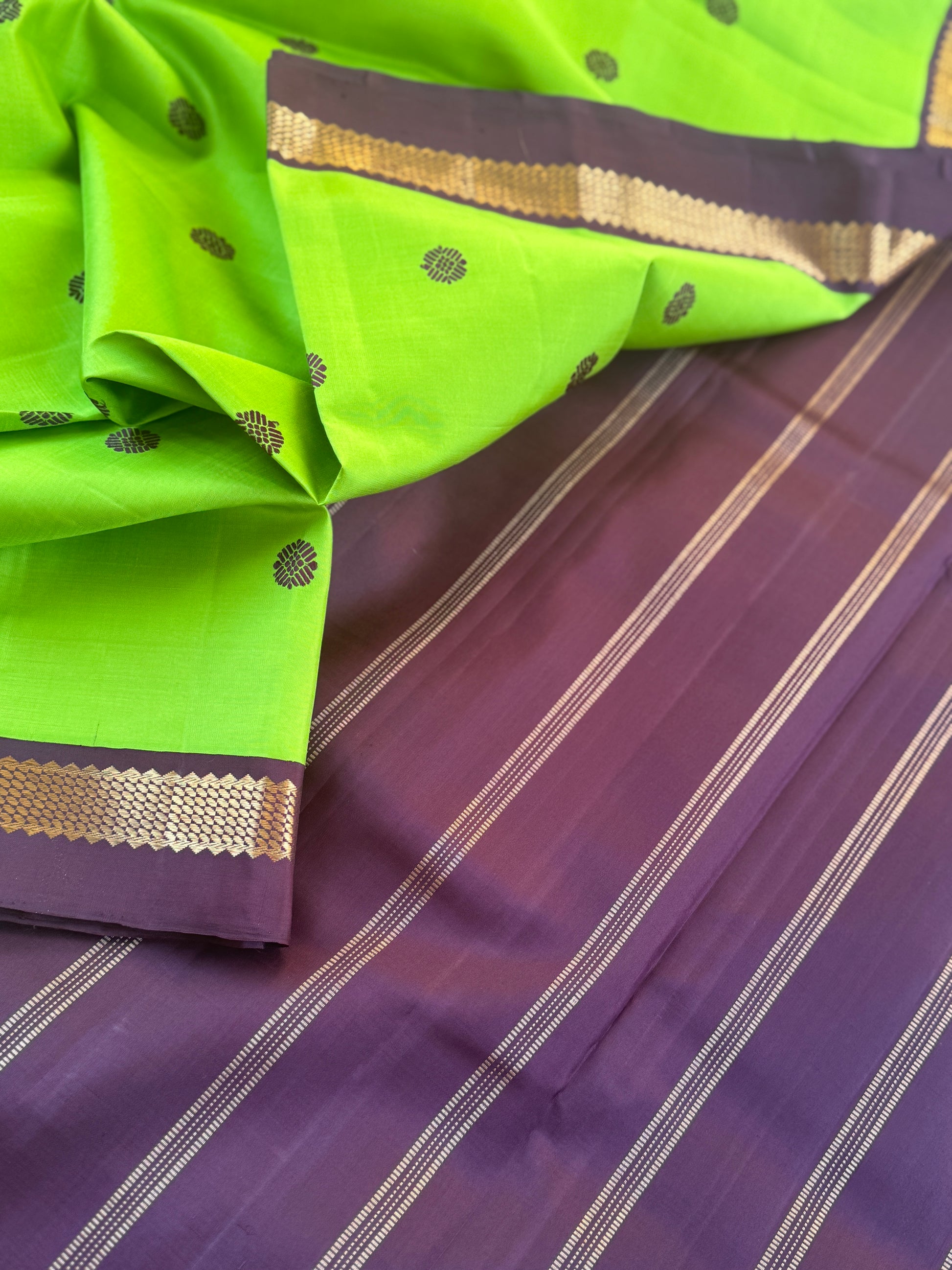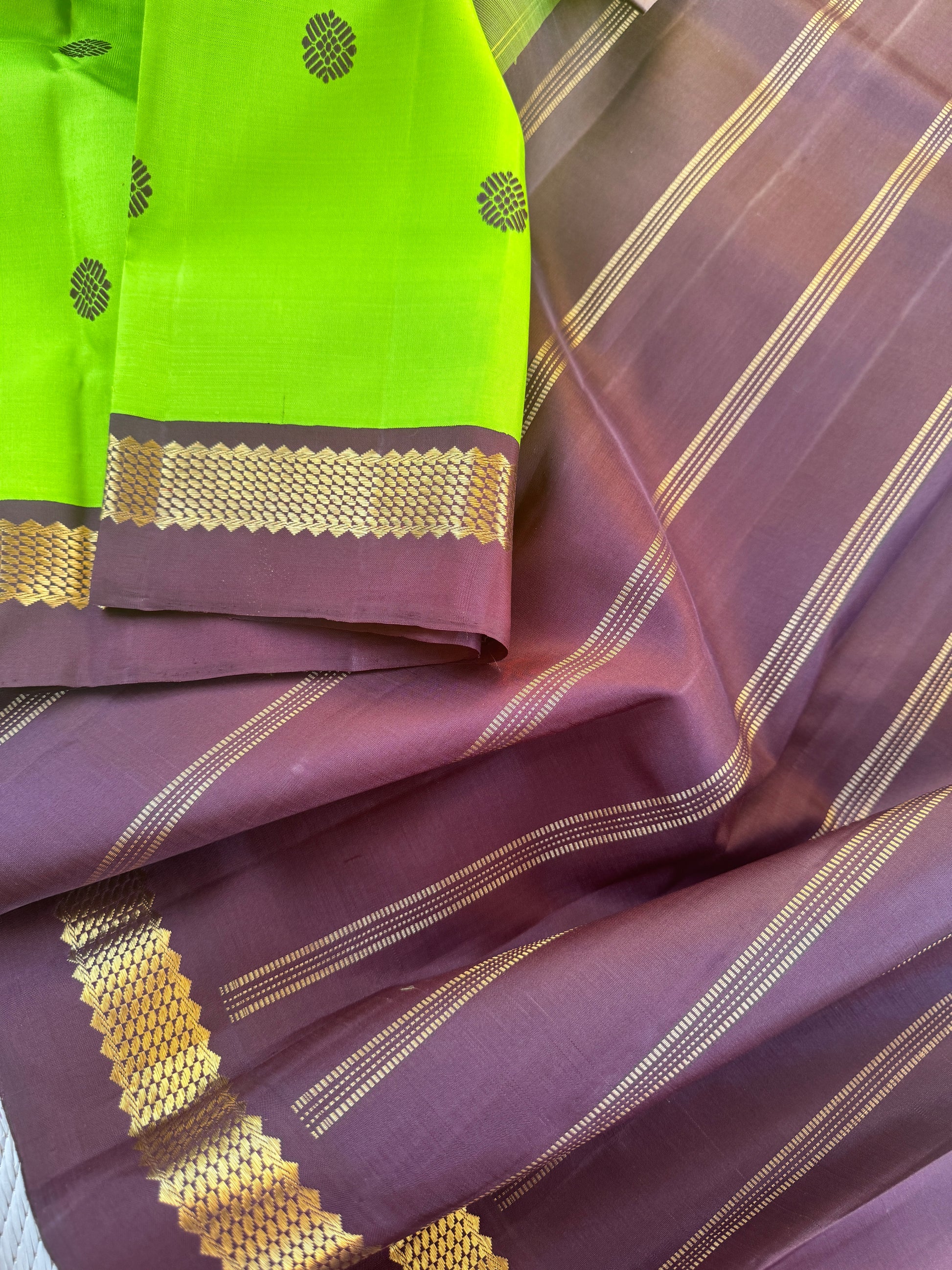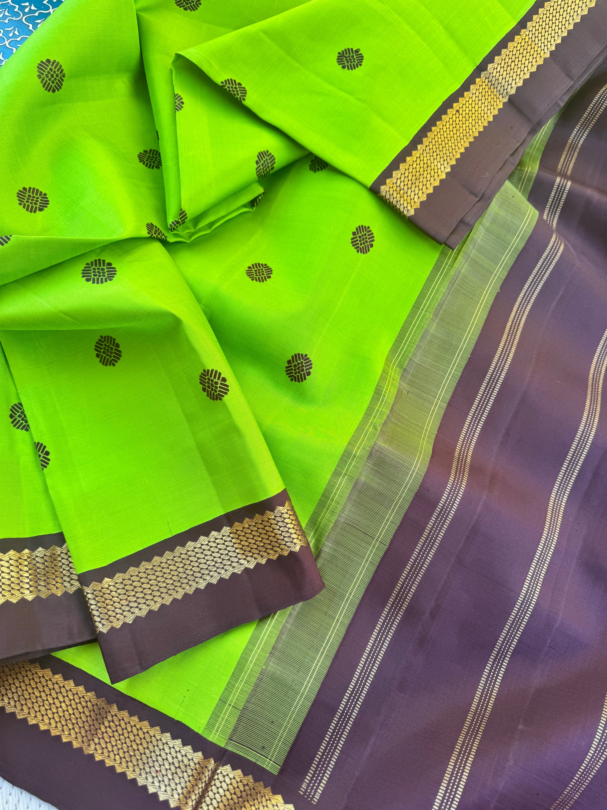 A vintage recreated Korvai Kanjivaram in Leaf green (elai pachai) with suryakamalam buttas on the body in silk contrasted by brown borders with seer mundhi/pallu. Woven in pure silk and zari.