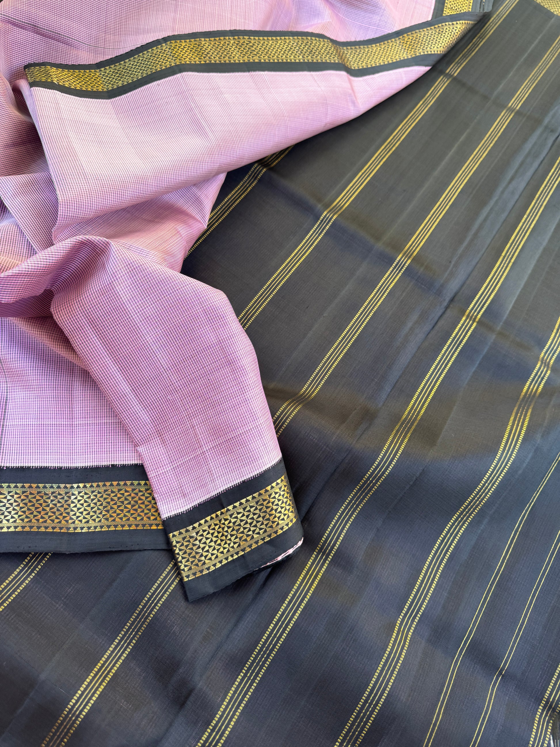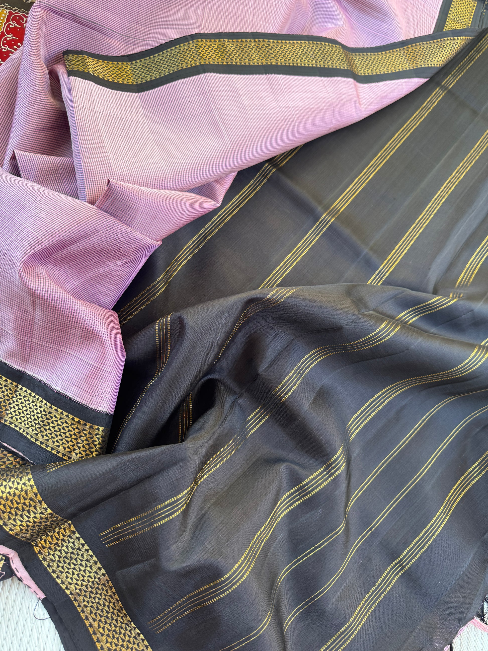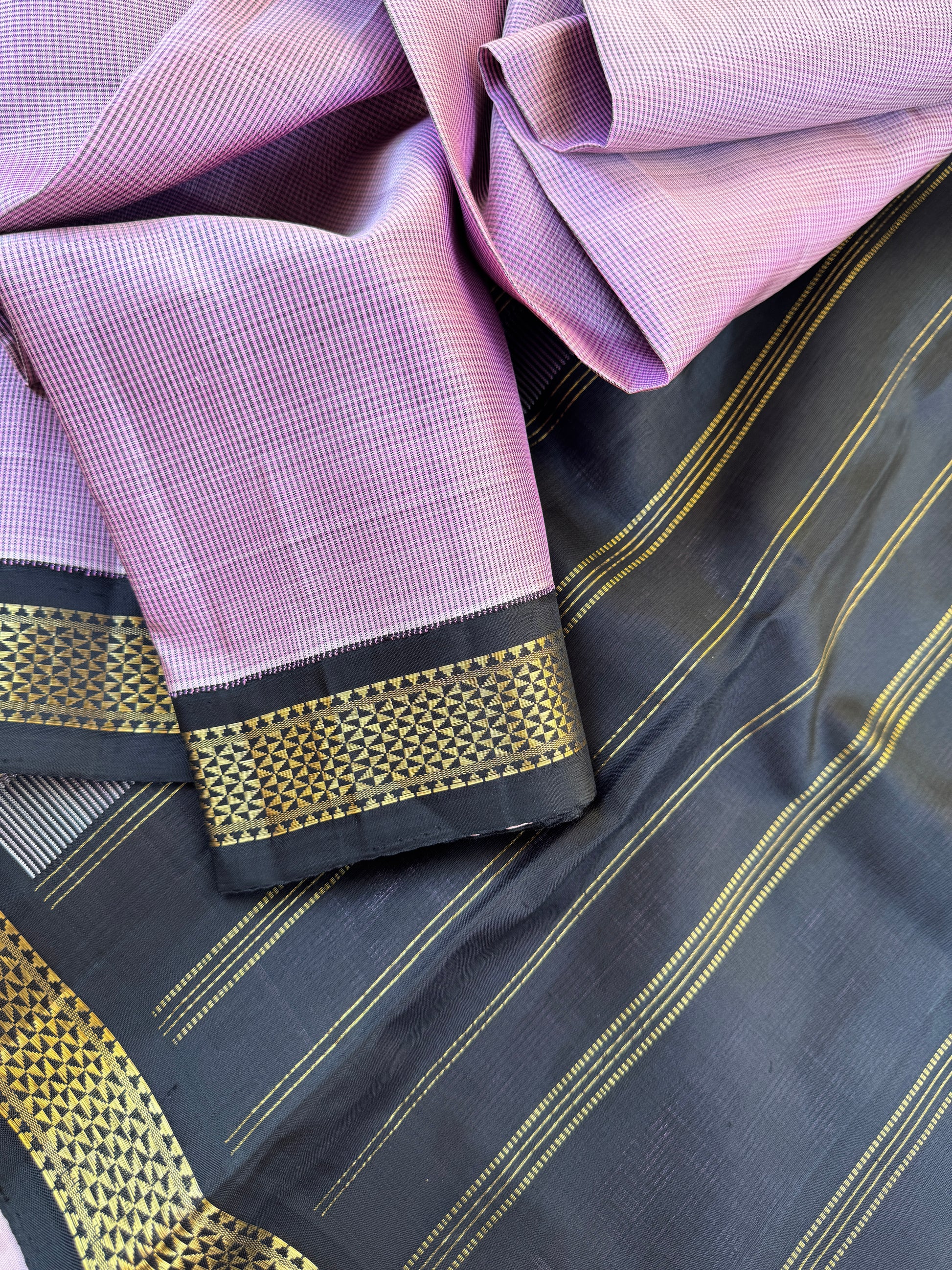 A vintage inspired Korvai Kanjivaram in with nano checks of mauve and black crossing to form super fine checks contrasted by korvai borders in black. Woven in pure silk and zari.