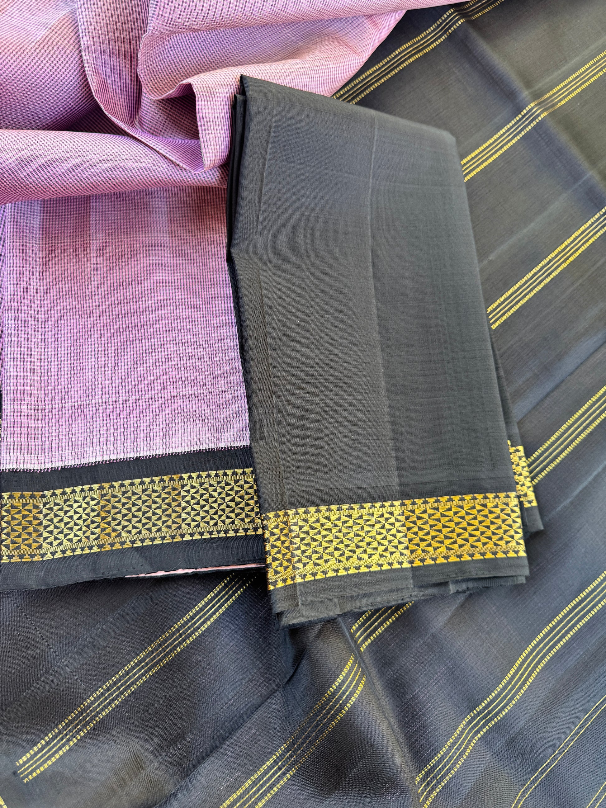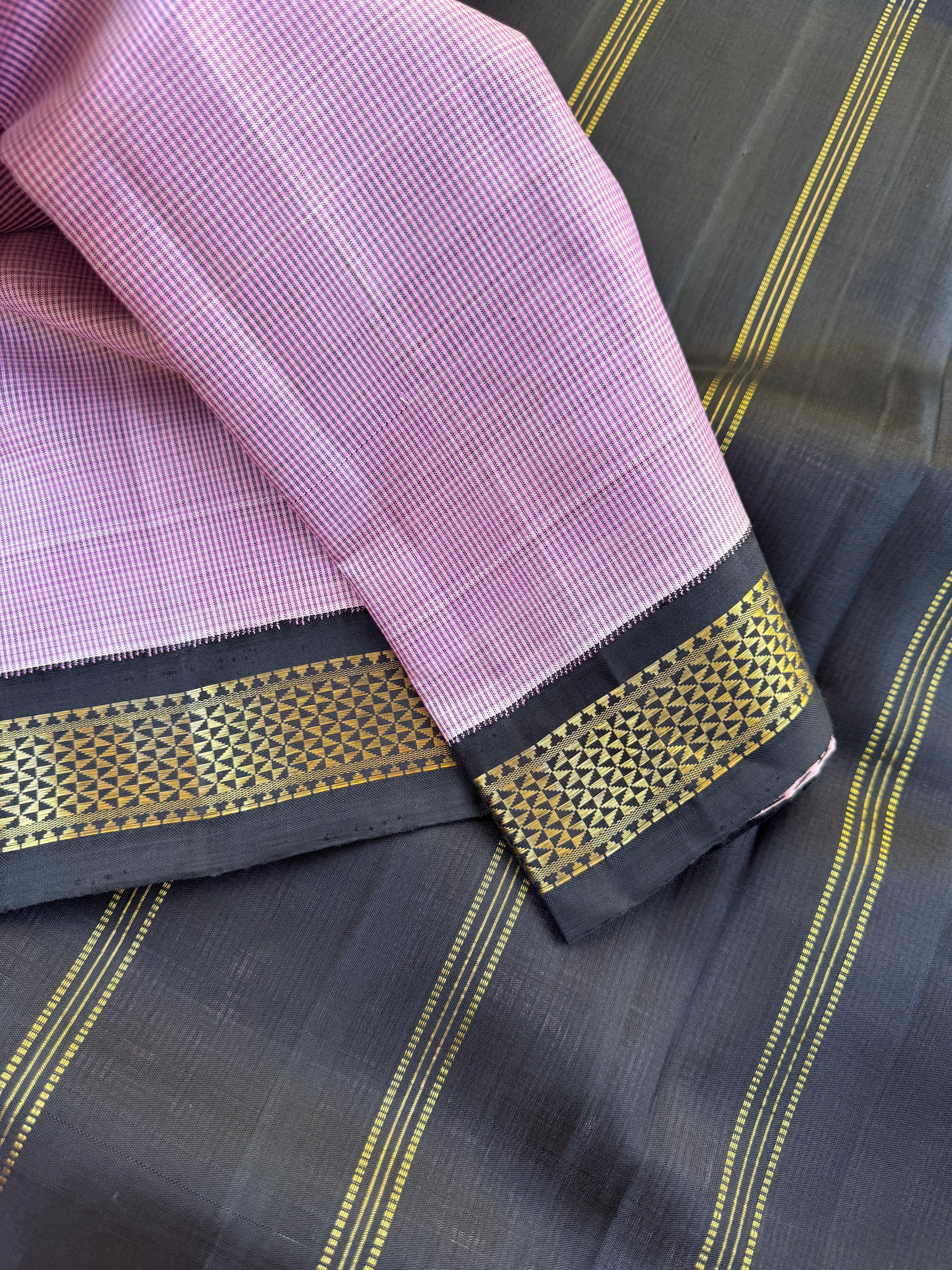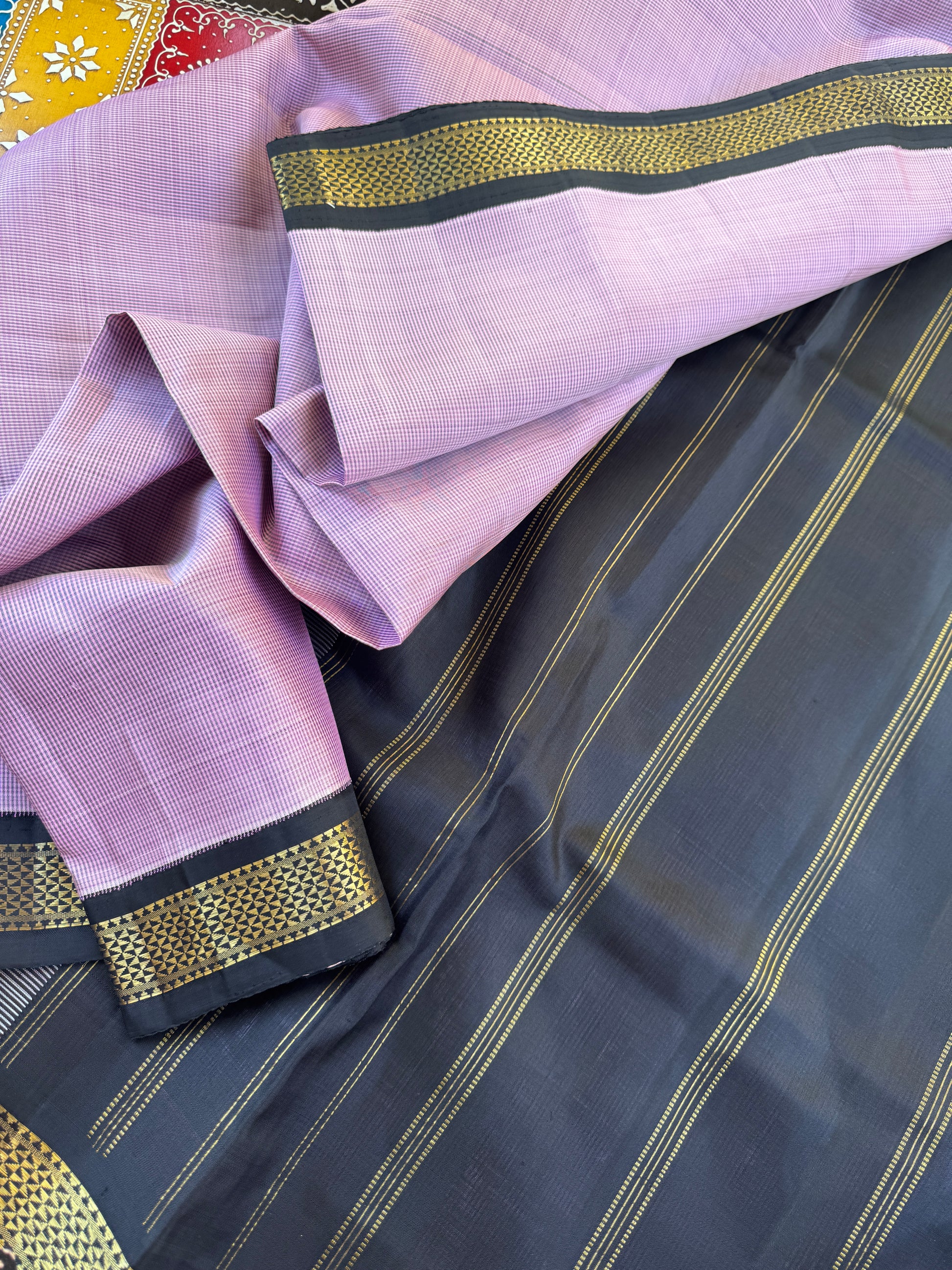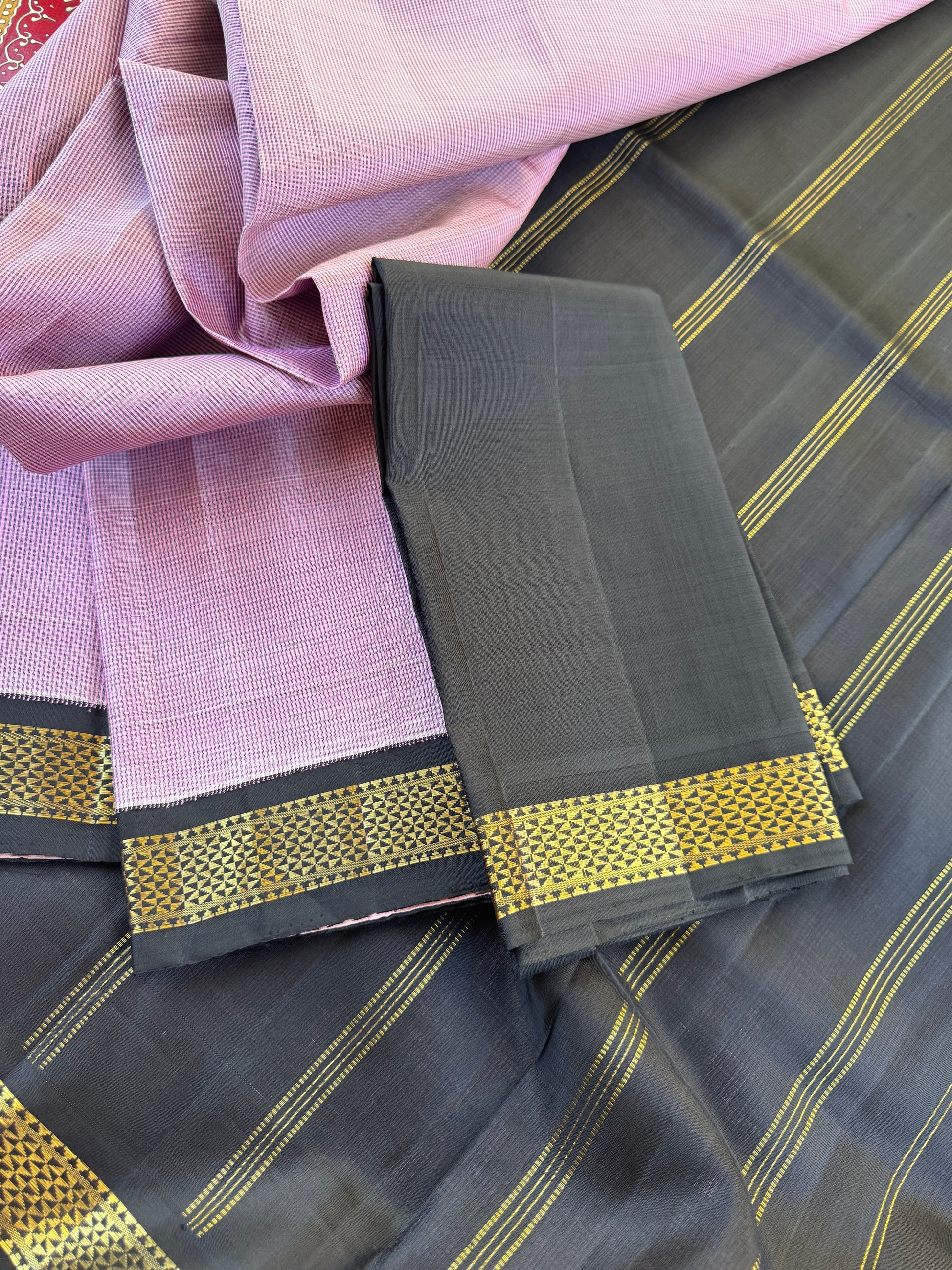 A vintage inspired Korvai Kanjivaram in with nano checks of mauve and black crossing to form super fine checks contrasted by korvai borders in black. Woven in pure silk and zari.