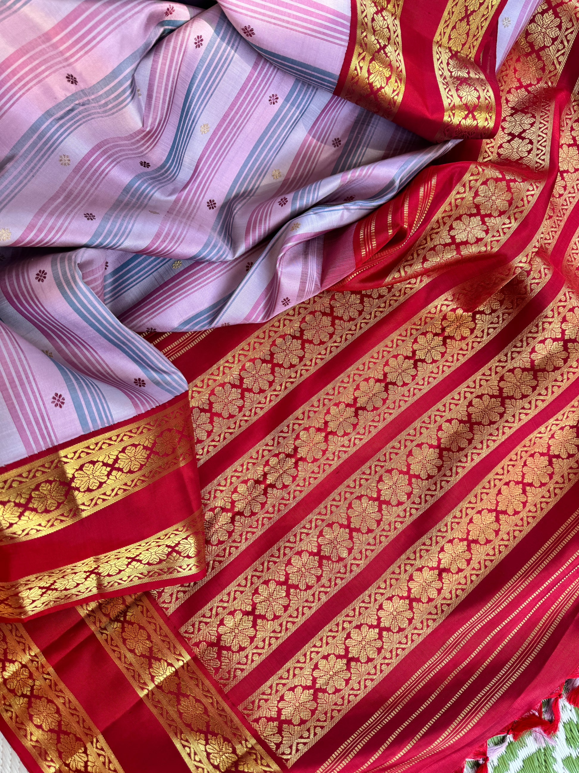 A beautiful handwoven Korvai Kanjivaram silk inspired/recreated from a vintage Kanjivaram in such lovely colors. The saree is woven in pure silk with hand interlocked korvai borders (kai korvai), pure zari and adai woven.